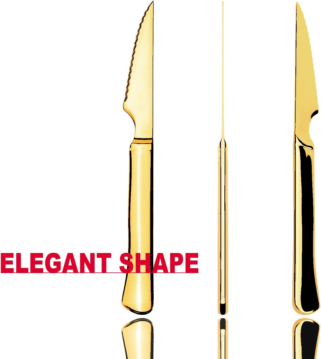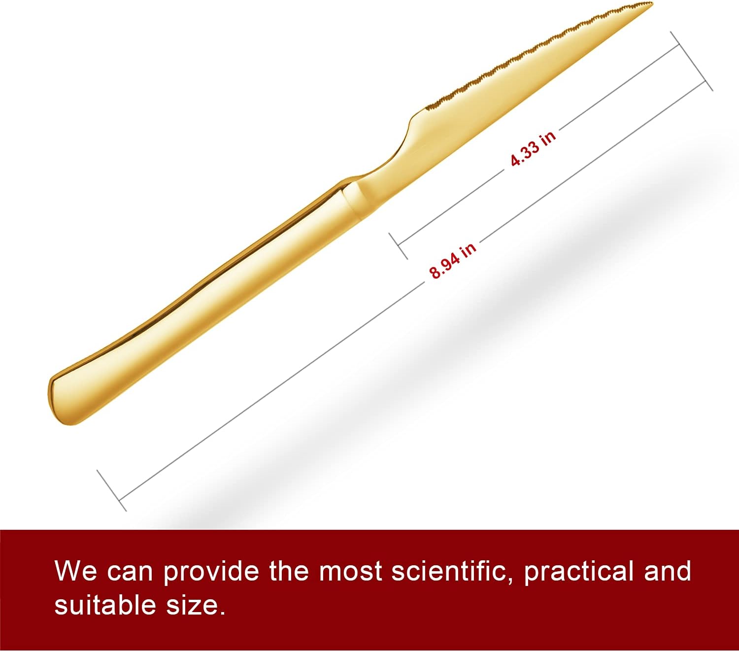 Elegant High carbon gold stainless steel knives.ice hardened blades are sharp , maximum corrosion resistance and durability.We redesigned the saw blade to make it well cut, easy to clean and well suited for every day type foods.They are simple and elegant. The all-stainless has a clean and streamlined look and better matches other stainless steel silverware set.
