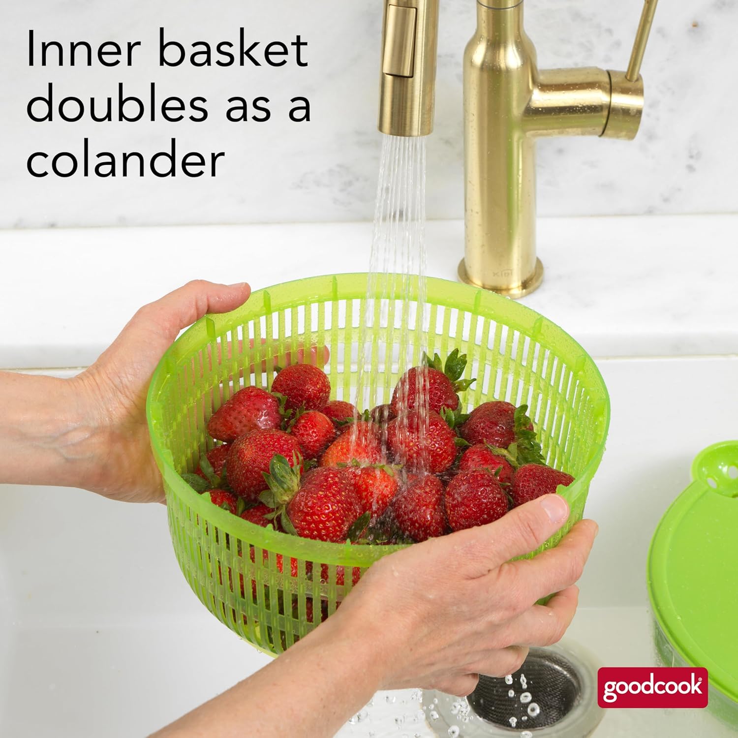 Enhance your kitchen with the GoodCook Everyday Salad Spinner, a must-have gadget for efficiently washing and drying your leafy greens. This salad spinner is designed with a large 5 qt. capacity basket and rotating turn knob to make washing and drying lettuce, spinach, herbs, and other leafy greens faster and more efficient. The removable inner basket allows water to strain through and collect in the bottom of the bowl, and it can also be used on its own as a colander to wash other fruits and vegetables. The built-in pour spout features integrated holes on the lid to prevent veggies from falling out while draining excess water, and the soft-touch turn knob and contoured plastic handle provide a secure grip and make this salad spinner more comfortable to use. The durable BPA-free polypropylene plastic construction with TPR rubber handle stands up to every day use and is dishwasher-safe for easy care and clean up. This salad spinner measures 12″ x 10.2″ x 6.25″ for convenient storage in cabinets and on shelves when not in use.