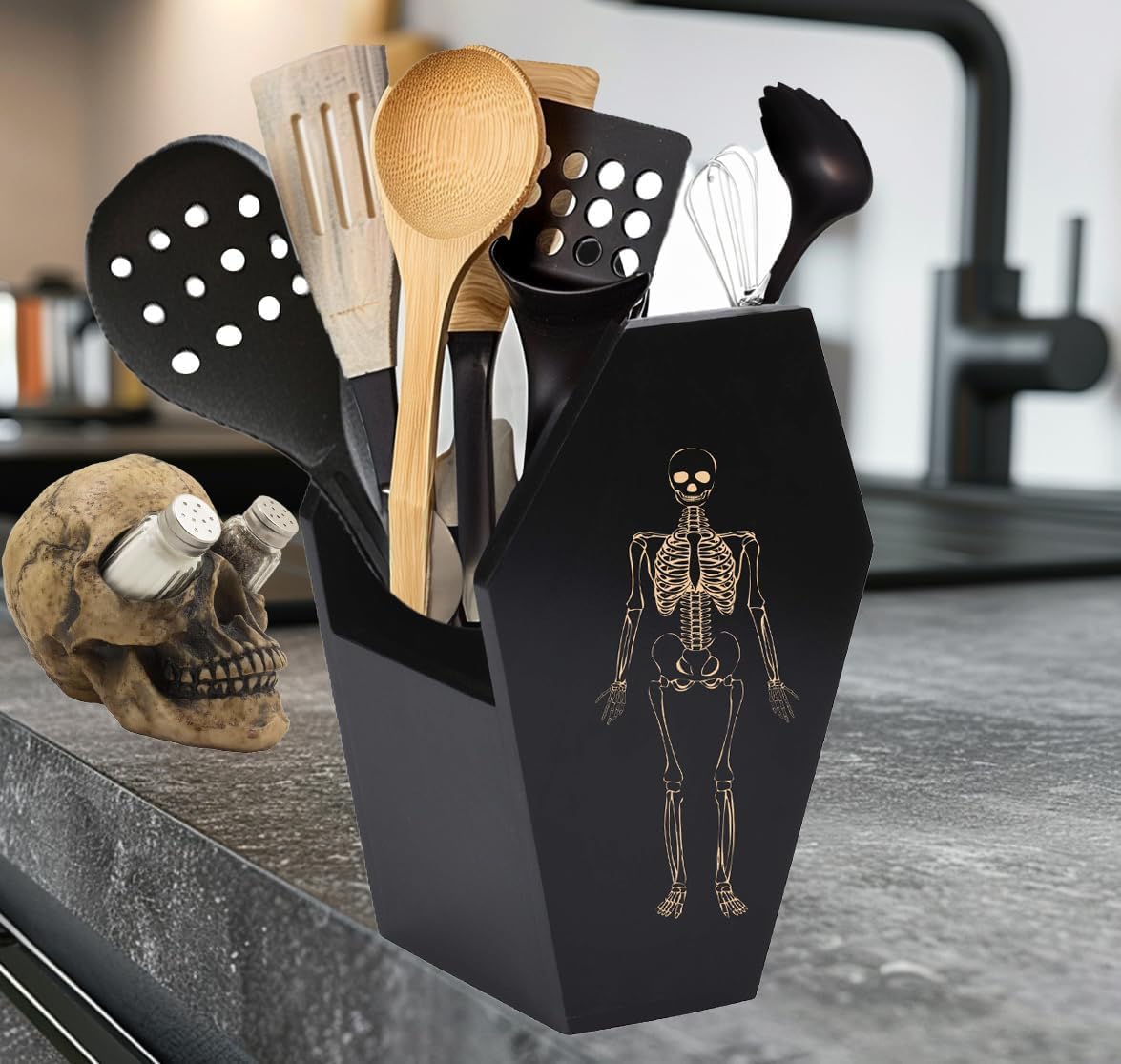 Unique Gothic Kitchenware Elevate your Fun kitchen aesthetics with the Coffin Utensil Holder featuring a cool etched skeleton design. This gothic kitchenware is perfect for adding a touch of spooky elegance to your cooking space. Made for goth kitchen utensils it combines functionality with striking decor. Get this unique gothic kitchen accessory today and transform your unique kitchen into a stylish haven ideal for gothic kitchen decor and gothic home decor