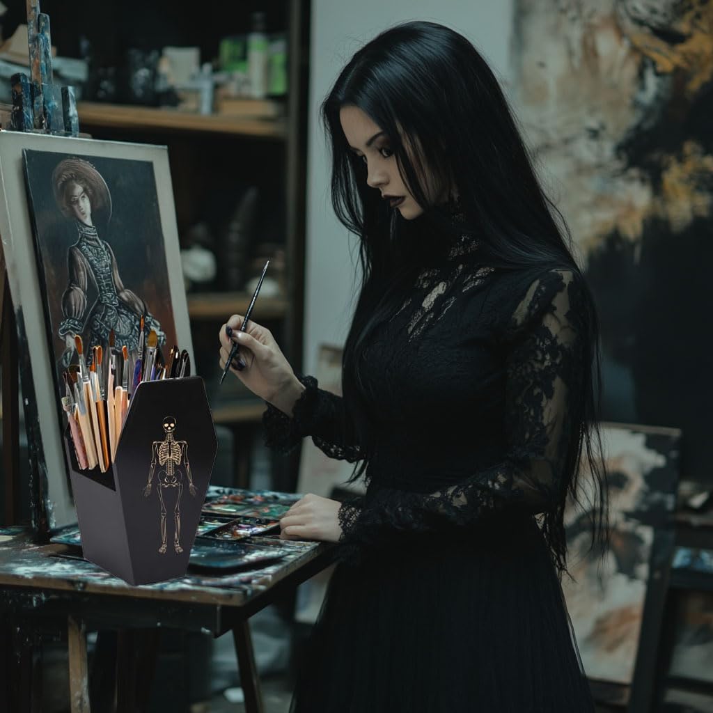 Halloween gifts for women, for Goth Enthusiasts Looking for the perfect gift for a goth or Halloween enthusiast This coffin utensil holder with an etched skeleton design is an ideal choice. It’s unique functional and stylish making it a standout piece in any kitchen. Surprise your loved ones with this distinctive gothic home decor item and let them enjoy its spooky charm all year round. It’s a perfect addition to goth household items and gothic knife holder.