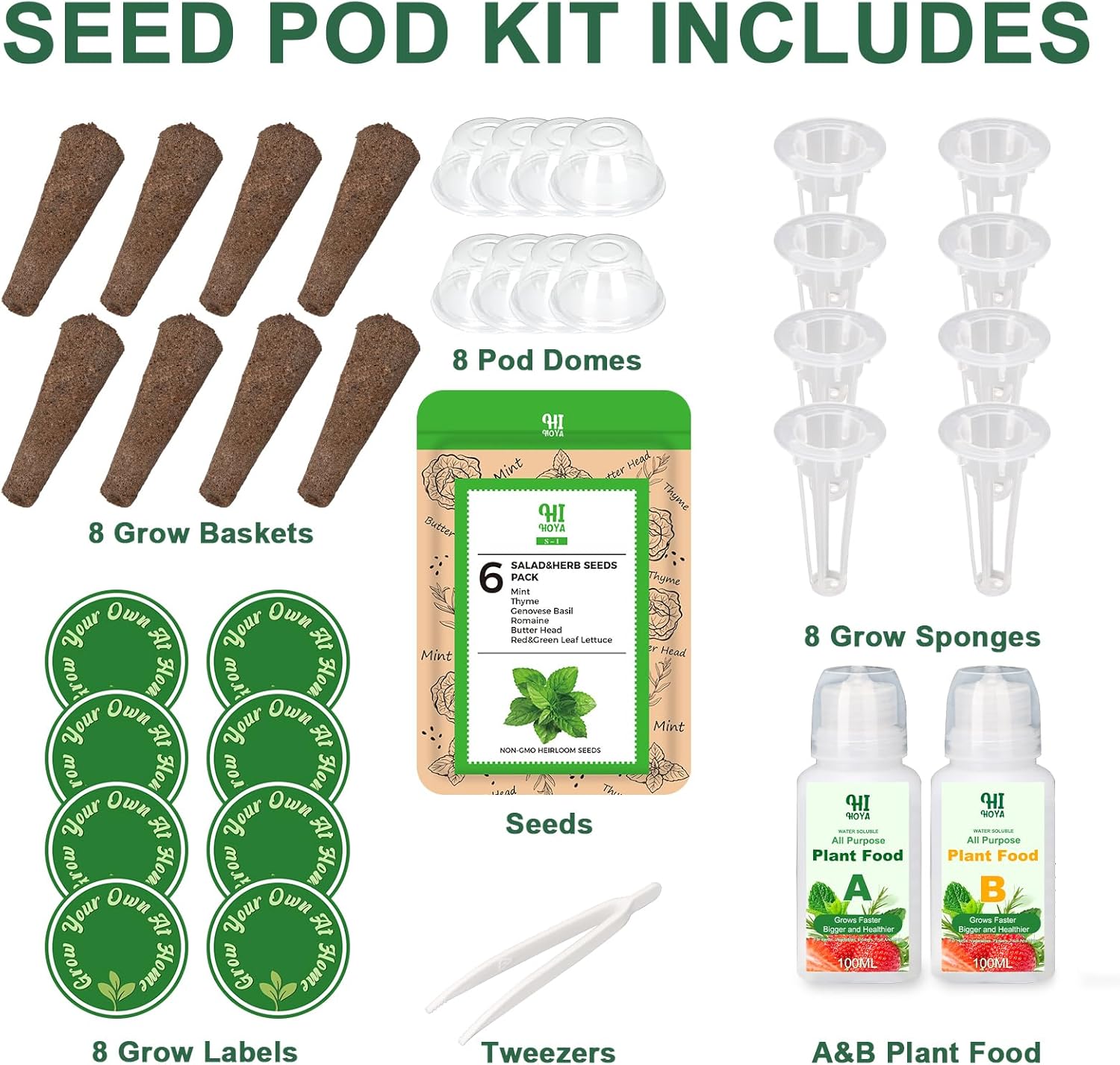 One Kit for All Your Needs: This grow anything seed pod kit is a comprehensive refill set, perfect for use in any indoor garden system. The hydroponic seed pods include 8 grow sponges, 8 pod labels, 8 grow baskets, 8 grow domes, 1 tweezers, A&B plant food, and 6 kinds of seeds