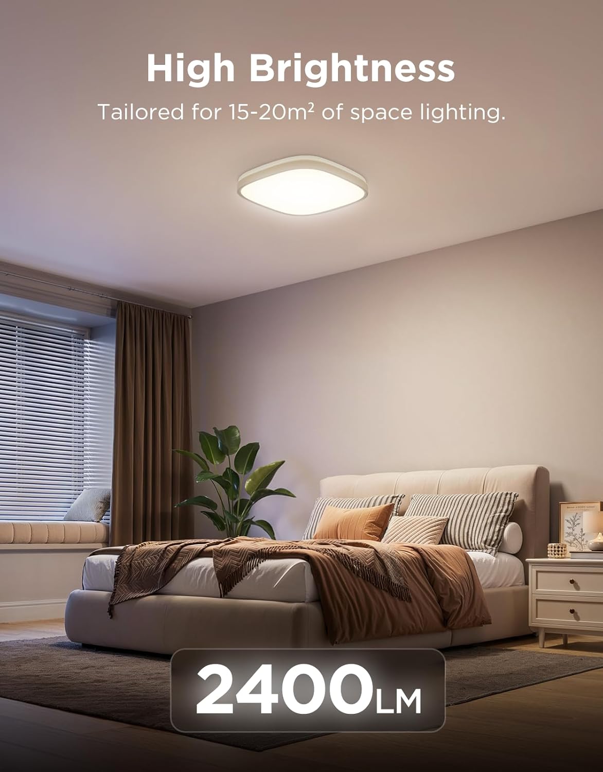 Adjustable Brightness & Color Temperature: This ceiling light offers up to 2400lm brightness, adjustable from 1% to 100%, making it suitable for rooms 15-20m². Offering color temperature ranges from 2700K to 6500K, you can easily switch between warm and cold lighting.