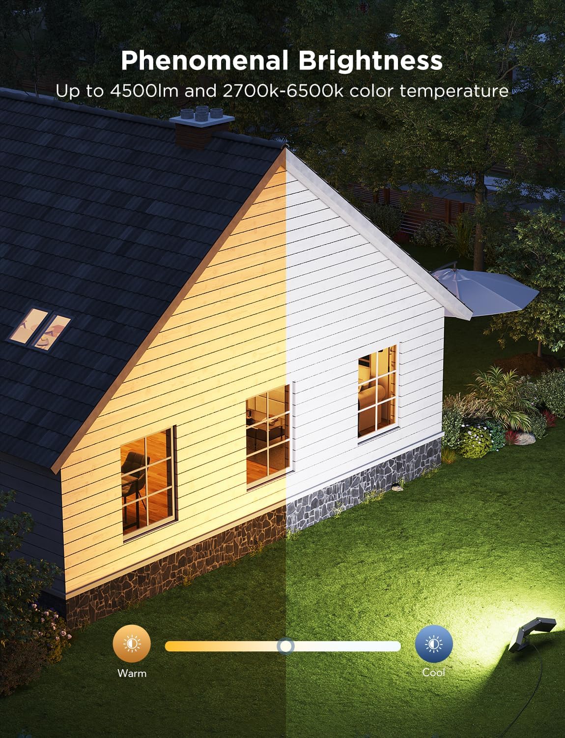 Dynamic RGBICWW Lighting and Unmatched Brightness: Advanced tech for achieving a spectrum of 16 million colors with up to 4500lm of brightness at low power of 48W. Along with warm and cool white lighting, govee outdoor flood lights discover unprecedented customization and dynamic effects for outdoor decorations.