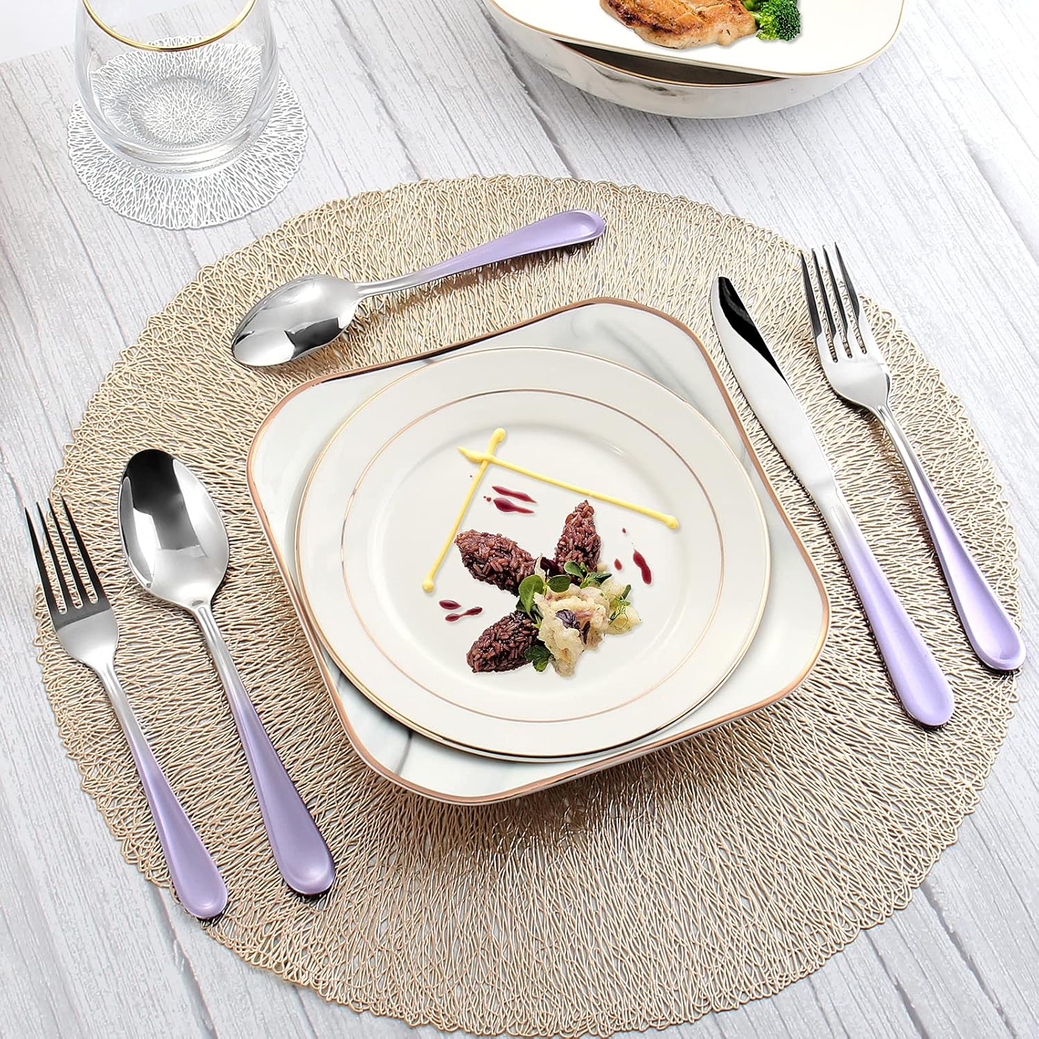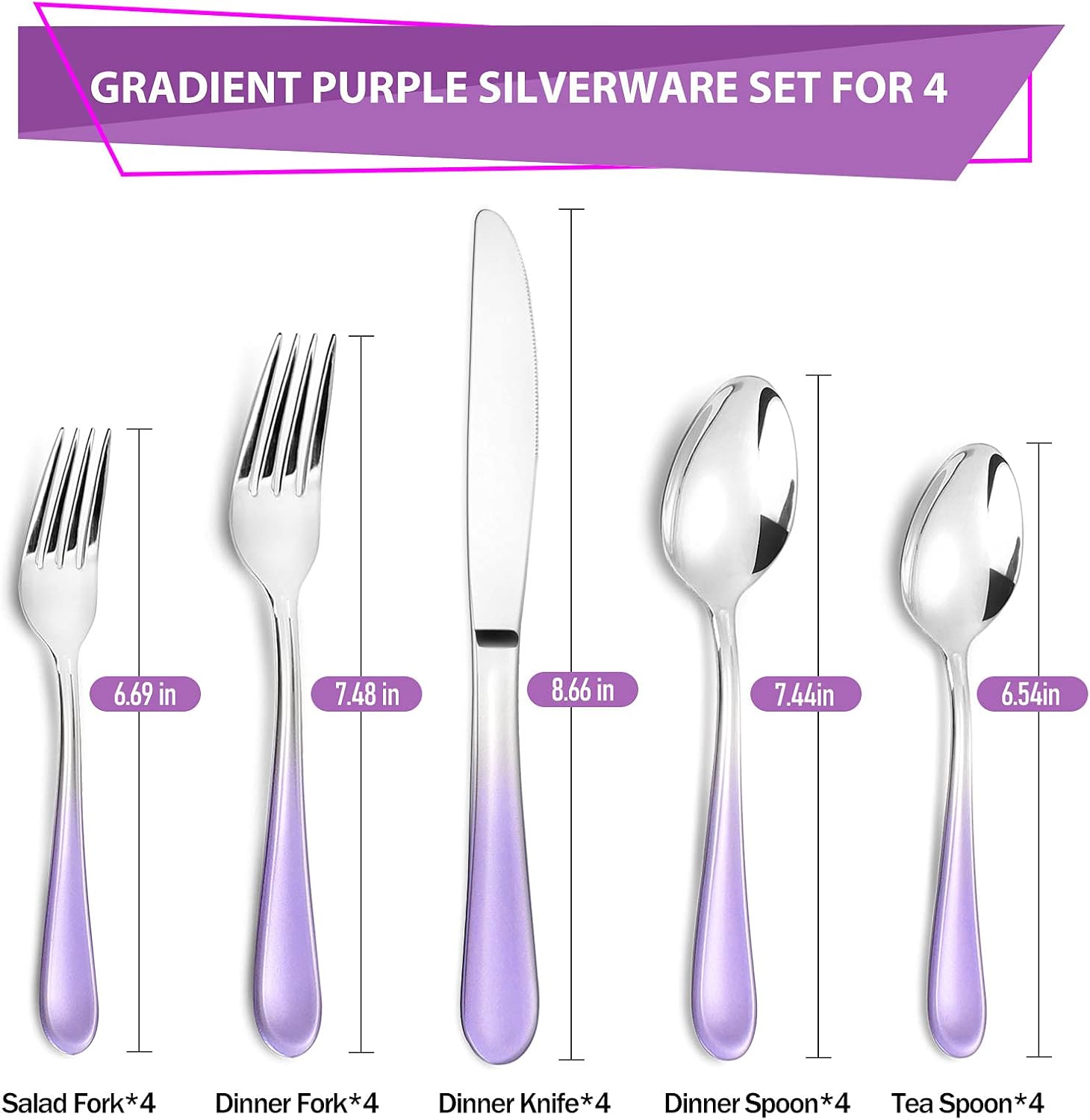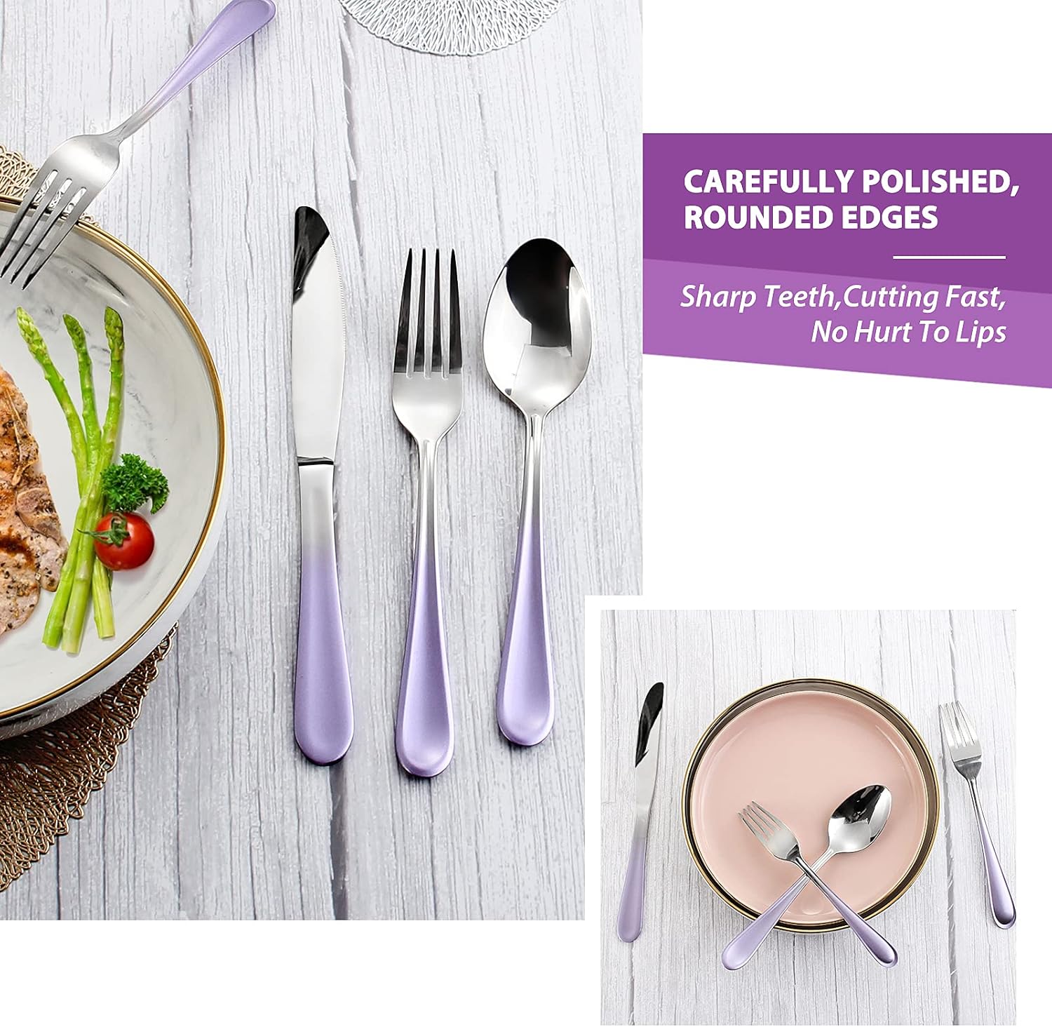 Gradient Design:Stainless steel flatware set.New gradient purple design,under your careful maintenance is not easy to fall off,there are three colors for your choice,and ergonomic design of curved handle make the weight balance of tableware,handle the tail design fashionable avant-courier,grip comfort,let you both visually and dining experience can be enjoyable.