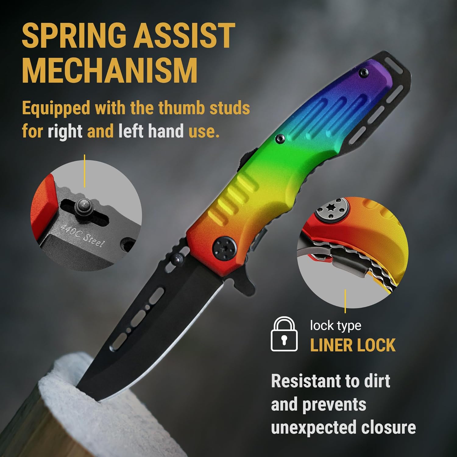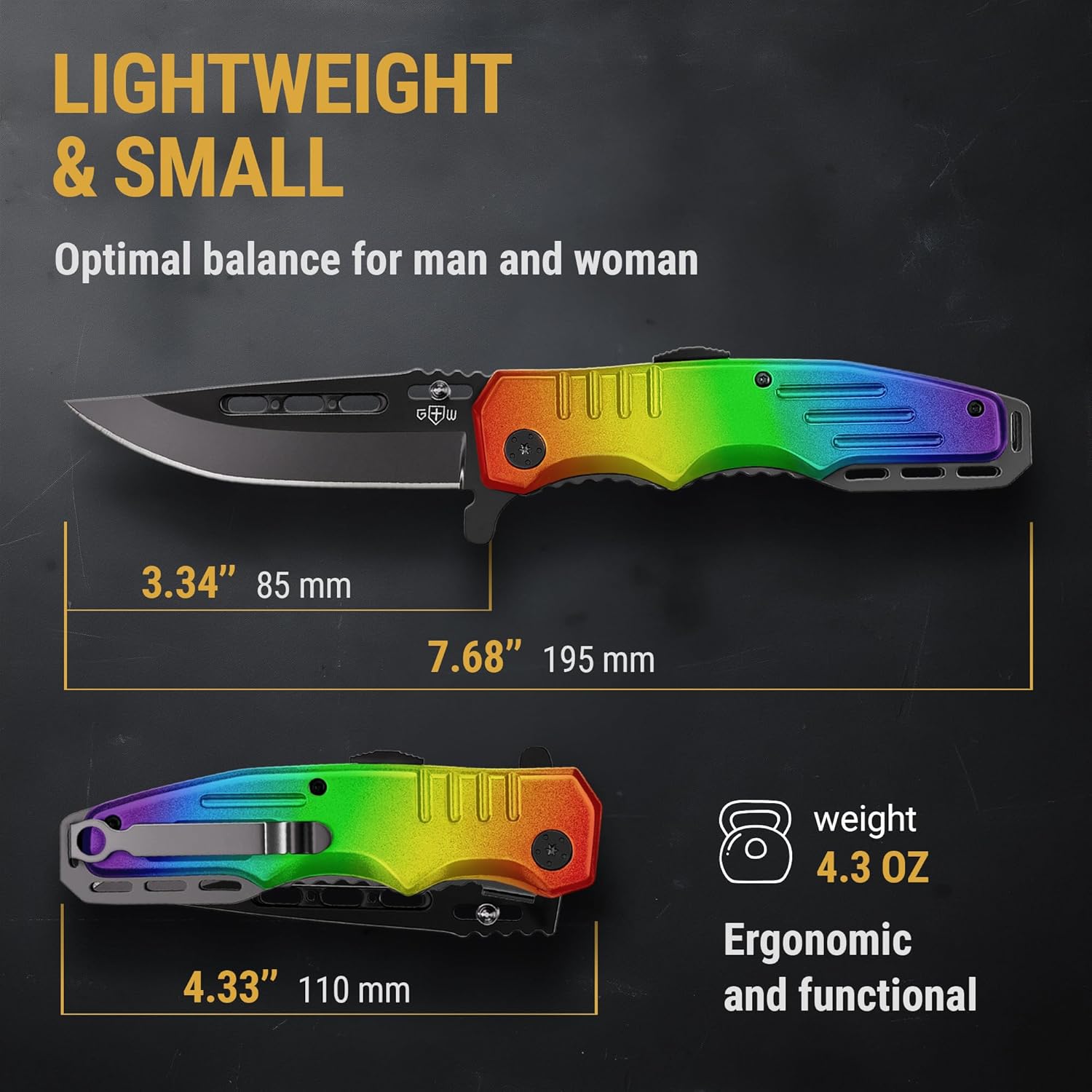 Rainbow pocket knife for men and women, made with high-quality stainless steel 440C and an aluminum handle for durability and comfort. It includes a pocket clip for easy carry and a reliable liner lock mechanism for safety. With thumb studs for effortless opening, this foldable knife combines sharpness, functionality, and a colorful design.