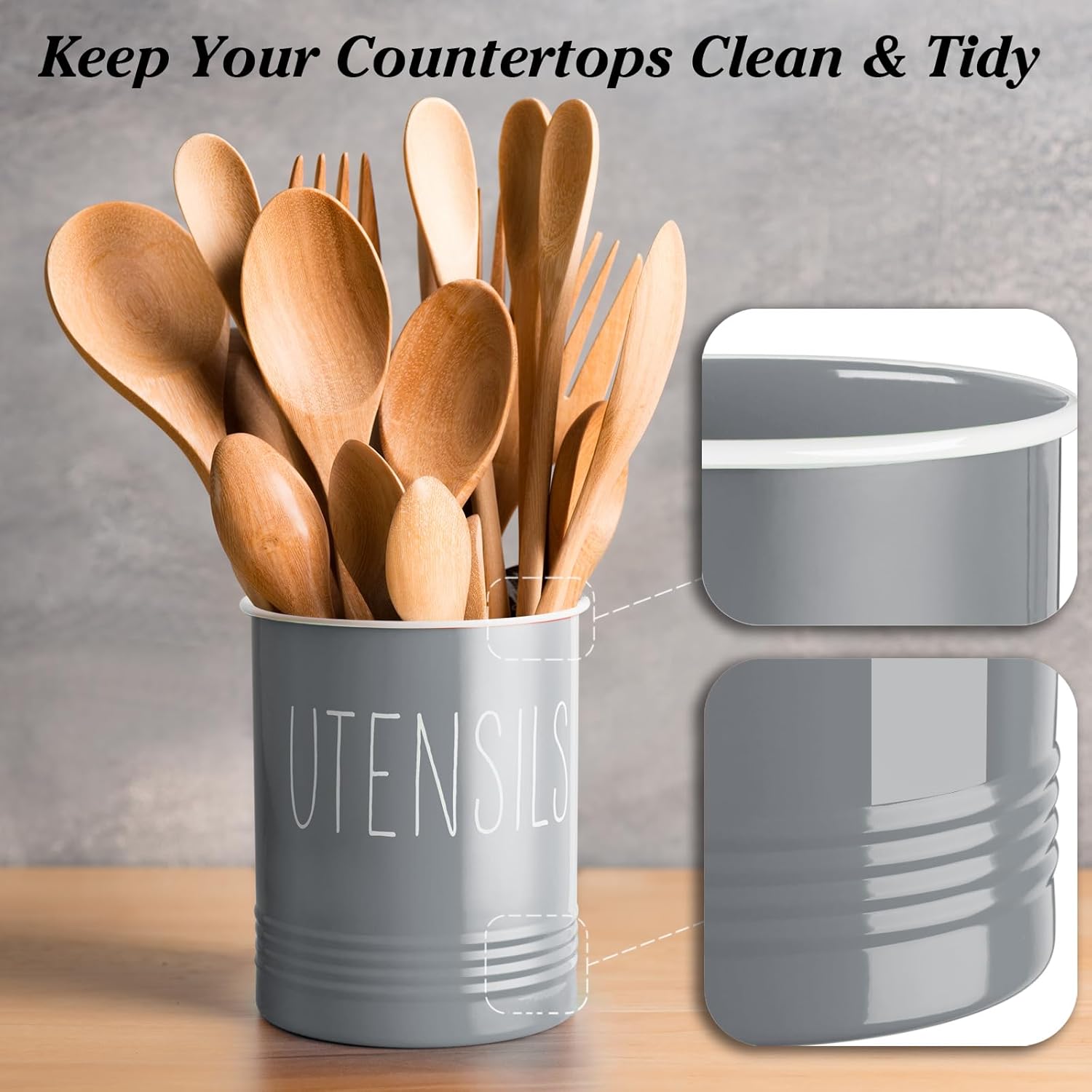 Metal Utensil Storage: The kitchen utensil holder is made of premium galvanized steel and finished with rust-resistant enameled coating, is ideal for keeping your everyday cooking utensils like spoons, whisks, tongs well organized.