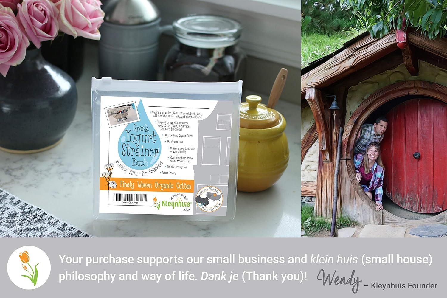 Turn any colander into an ultra-fine strainer. Simply line your colander with this bowl-shaped, reusable Kleynhuis Strainer Pouch (Patent Pending) and spoon in freshly made yogurt, cheese, nut milk or other fine foods. The Kleynhuis Strainer Pouch is WHEY better than cheesecloth!