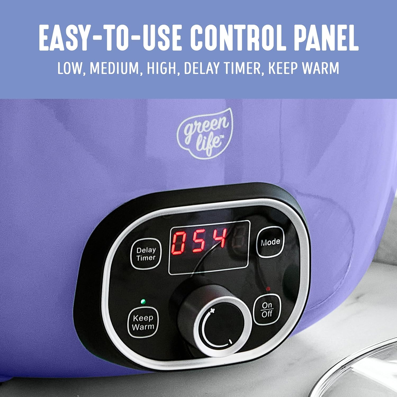 This multipurpose slow cooker has an easy-to-use nonstick pot you can pop out for quick searing and sautéing, then just return it to the base to keep cooking low and slow. It’s the perfect way to infuse any meal with mouthwatering flavor. The extra deep 6QT pot features our healthy ceramic nonstick coating for effortless cleanup and fantastic performance. It’s also free of PFAS, PFOA, lead, and cadmium, so everything you make will be a little healthier. The easy-to-use control panel has five cooking functions to perfect your meal, whether you want to delay the start for a few hours or program the Healthy Cooker for up to 10 hours. Once your meal is finished, this slow cooker switches to the warm mode to keep your food ready for up to 4 hours. The lid and pot are dishwasher safe to make cleanup easy.