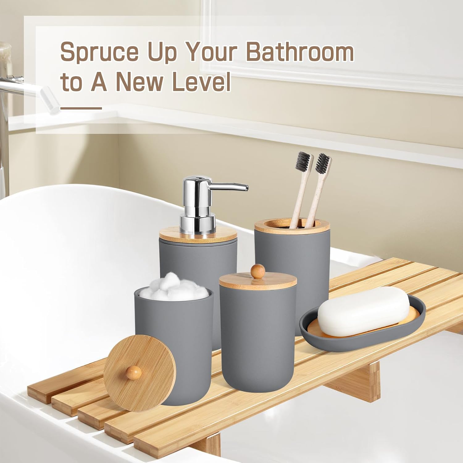 ✅【Great Value Plastic Bathroom Accessories】Our navy grey bathroom accessory set makes the bathroom in order and adds a boho, modern farmhouse element to match your bathroom perfectly. The grey bathroom accessories include 2 pack bathroom soap dispensers and a toothbrush holder set, tip holder, cotton ball holder with bamboo lids, and 9 pre-printed water-proof stickers, making your life simple.