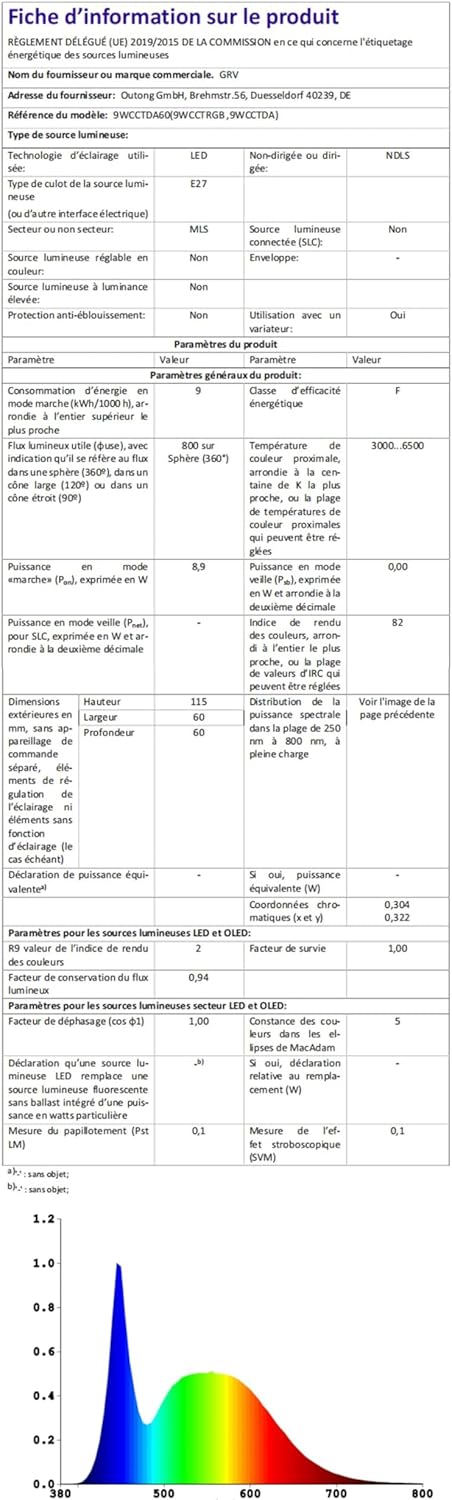 CCT:3000K-6500KBrightness:830lm,Dimming1%-100%Voltage: AC100-240VPower : 9WBase: E26CRI>80Remote control distance: 50ft Packaging includes: