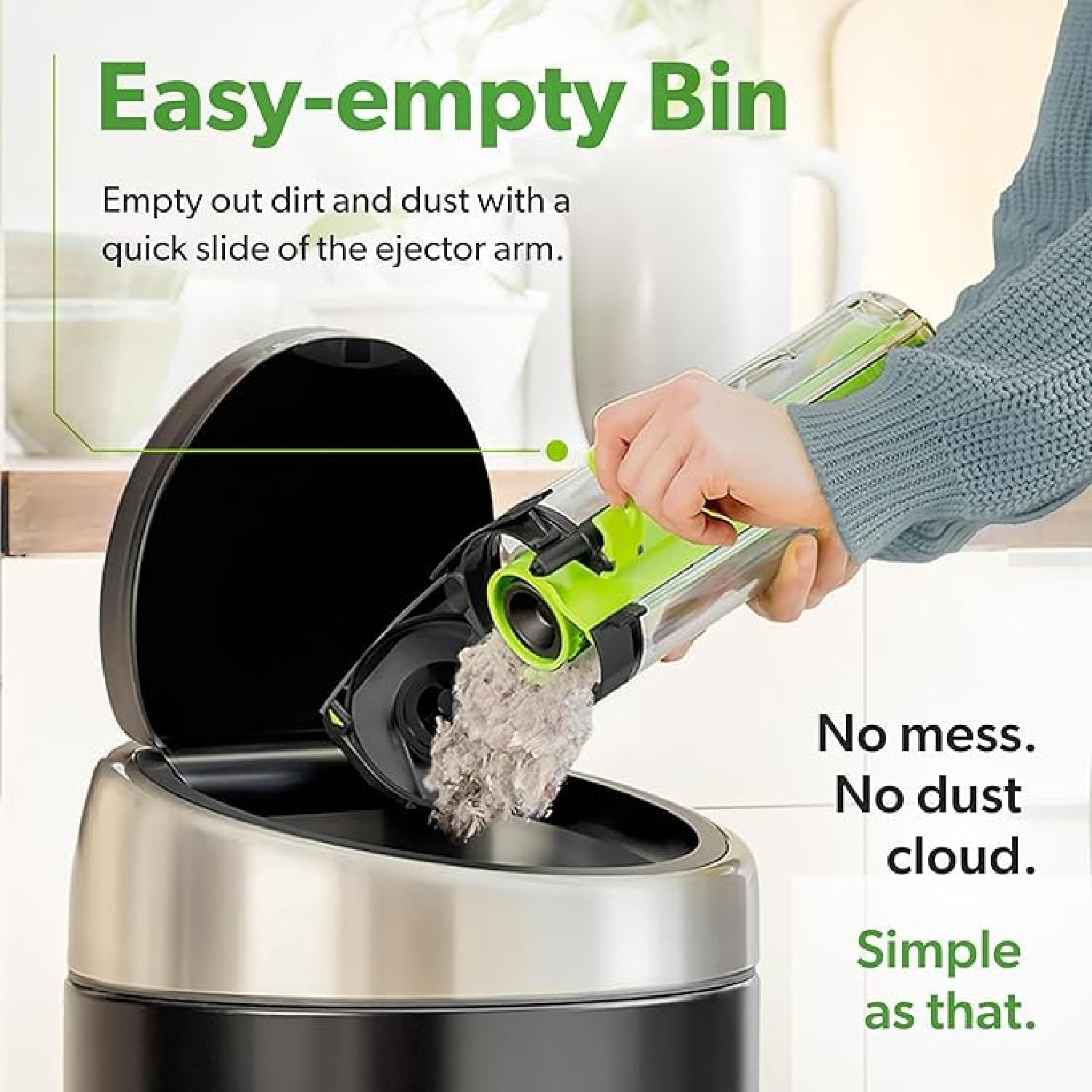 BAGLESS DESIGN: This vacuum’s waste disposal system is easy to empty on a regular basis. With a simple flip of a latch, the collected dirt and debris empties into your trash can.