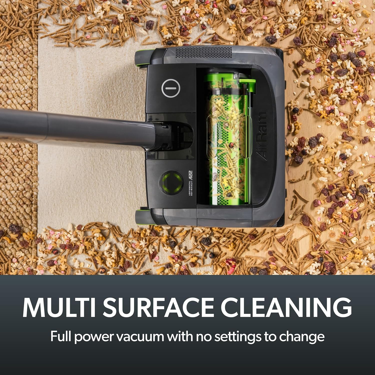 RECHARGEABLE BATTERY: Powered by a 22V Lithium-ion battery, the AirRAM MK2 provides up to 40 minutes of runtime after a 4-hour charge. The 4-stage LED indicator on the back of the vacuum gauges how much charge remains.