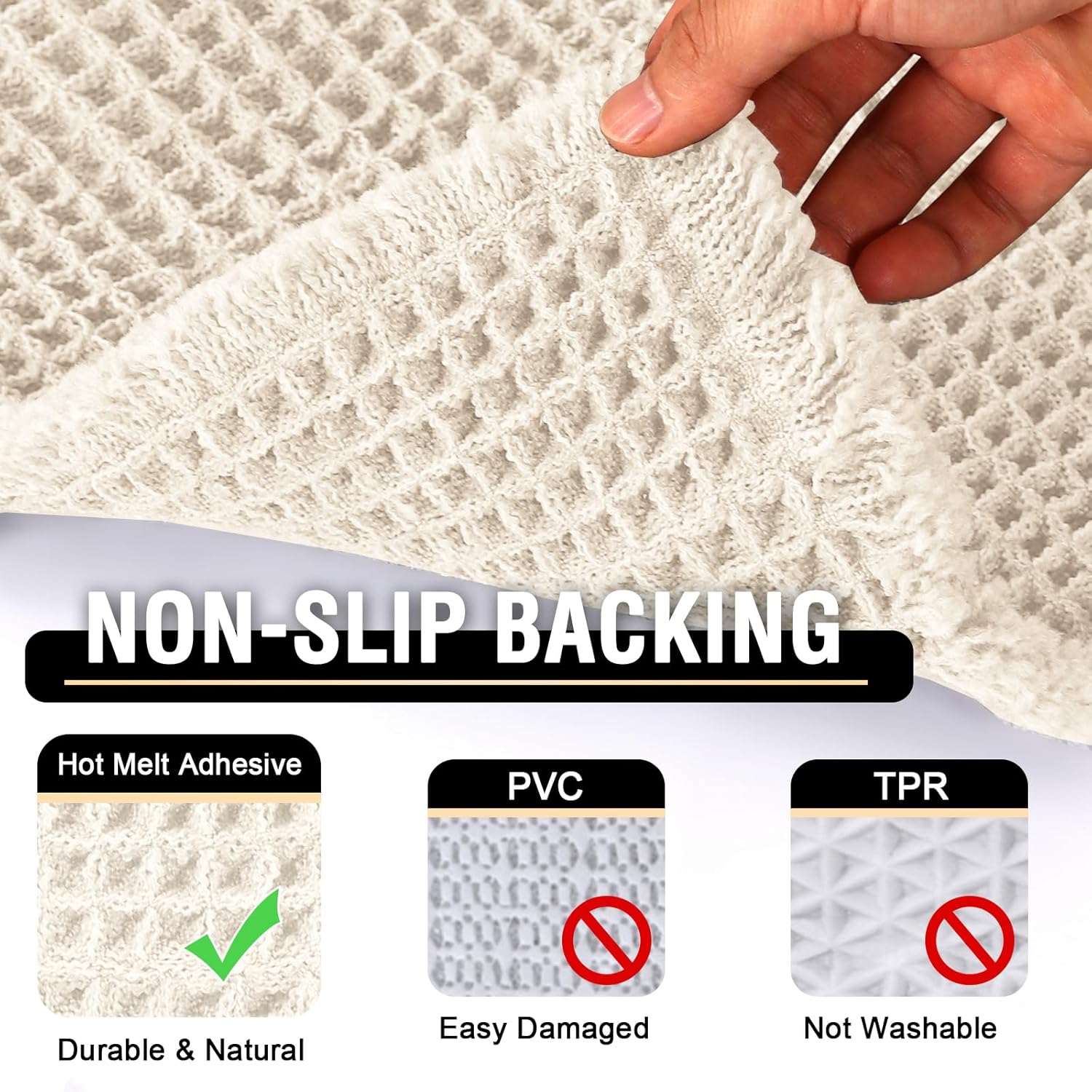 NON SKID: With updated version slip-resistant Hot Melt Backing. Offering good traction and grip on smooth surfaces, that ensures stability and prevents slips and falls