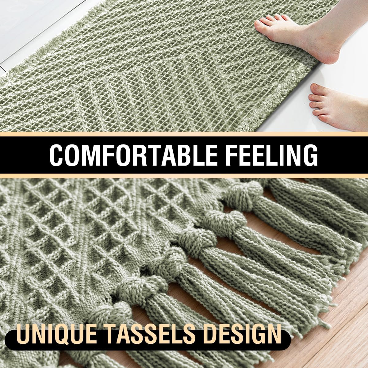 UNIQUE WAFFLE TASSELS DESIGN: This bath mat is power-loomed with upgraded yarns-Integrating decoration and durability, make the bath mats amazing soft and cozy like a comfortable quilt protector for your feet. Differ from other ordinary bath mat, the tassels makes this mat have more Design sensed.