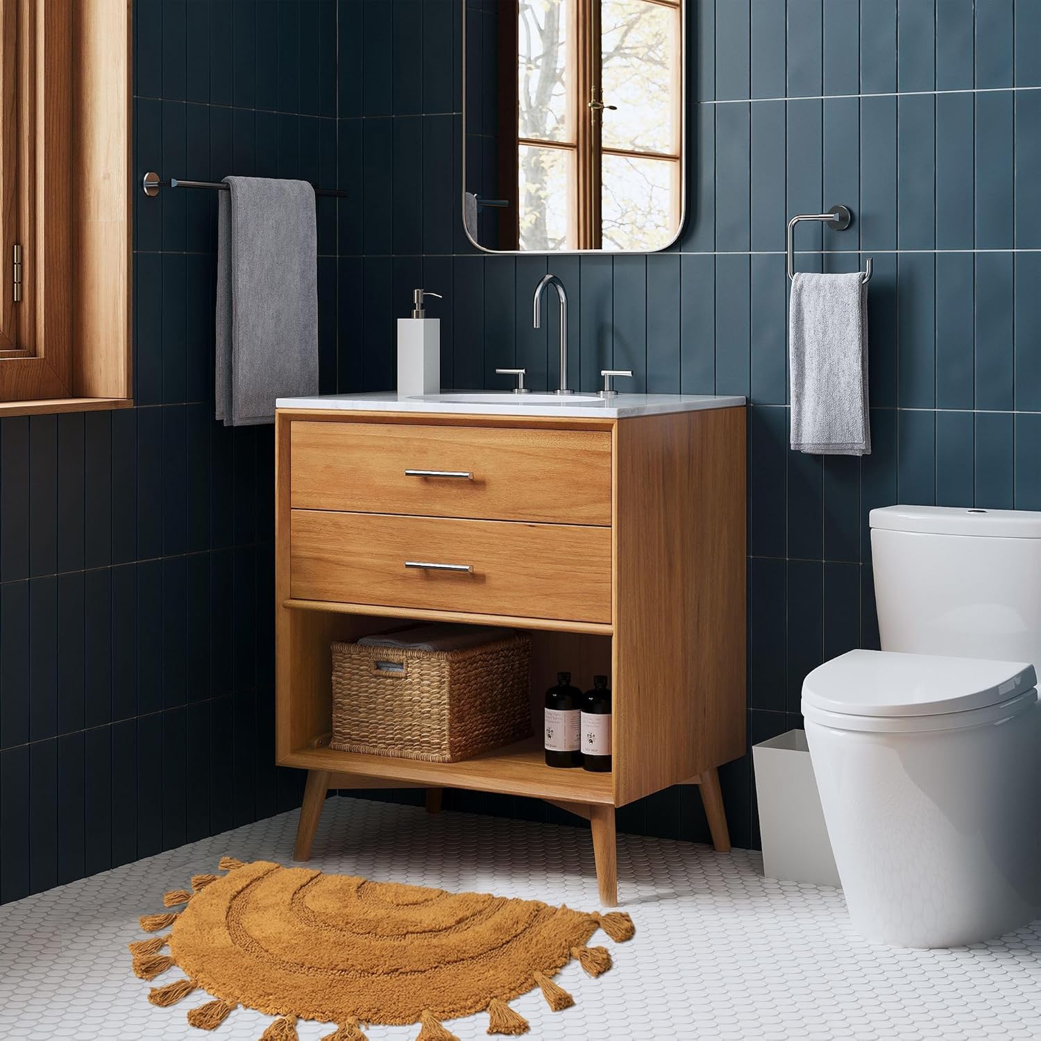 HAND WOVEN BATH MAT-The half-round boho bathroom rugs features stylish tassels trim,strong woven material gives a luxurious touch.A boho addition to your master bathroom or guest bath decor.It exemplifies the Boho, vintage, retro look that is so trendy these days.Create dreamy boho bathroom decor.With the top-notch boho bathroom rugs you can add a touch of homey bohemian charm to your bathroom and create your personal haven to relax & unwind.