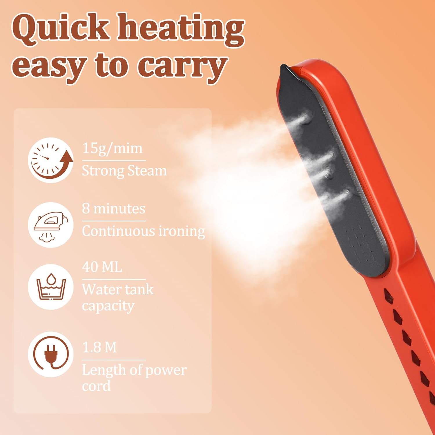 【High-efficiency Wrinkle Removal】: The portable iron with a power of 1200W, built-in water tank 50ml, the iron heats up in 15 seconds and has a large steam output of 18g/min. It quickly penetrates the fibers of clothes and easily removes stubborn creases. The professional compression function is designed at the seams of the collar, cuffs and trouser legs, making the lines of the clothes straighter.