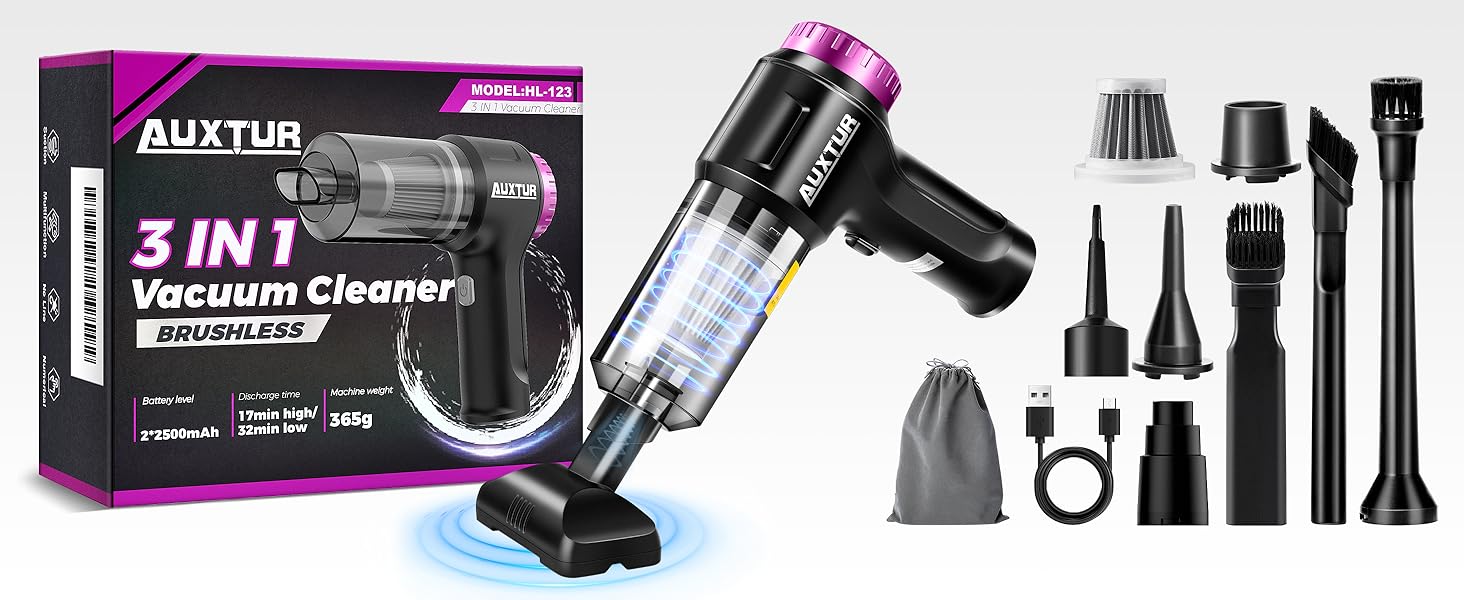 AUXTUR 3 in 1 vacuum cleaner has an excellent motor module and precise accessories, so the suction force of the compact equipment can reach 12000pa! And it also has an ultra long battery life and excellent grip feel!