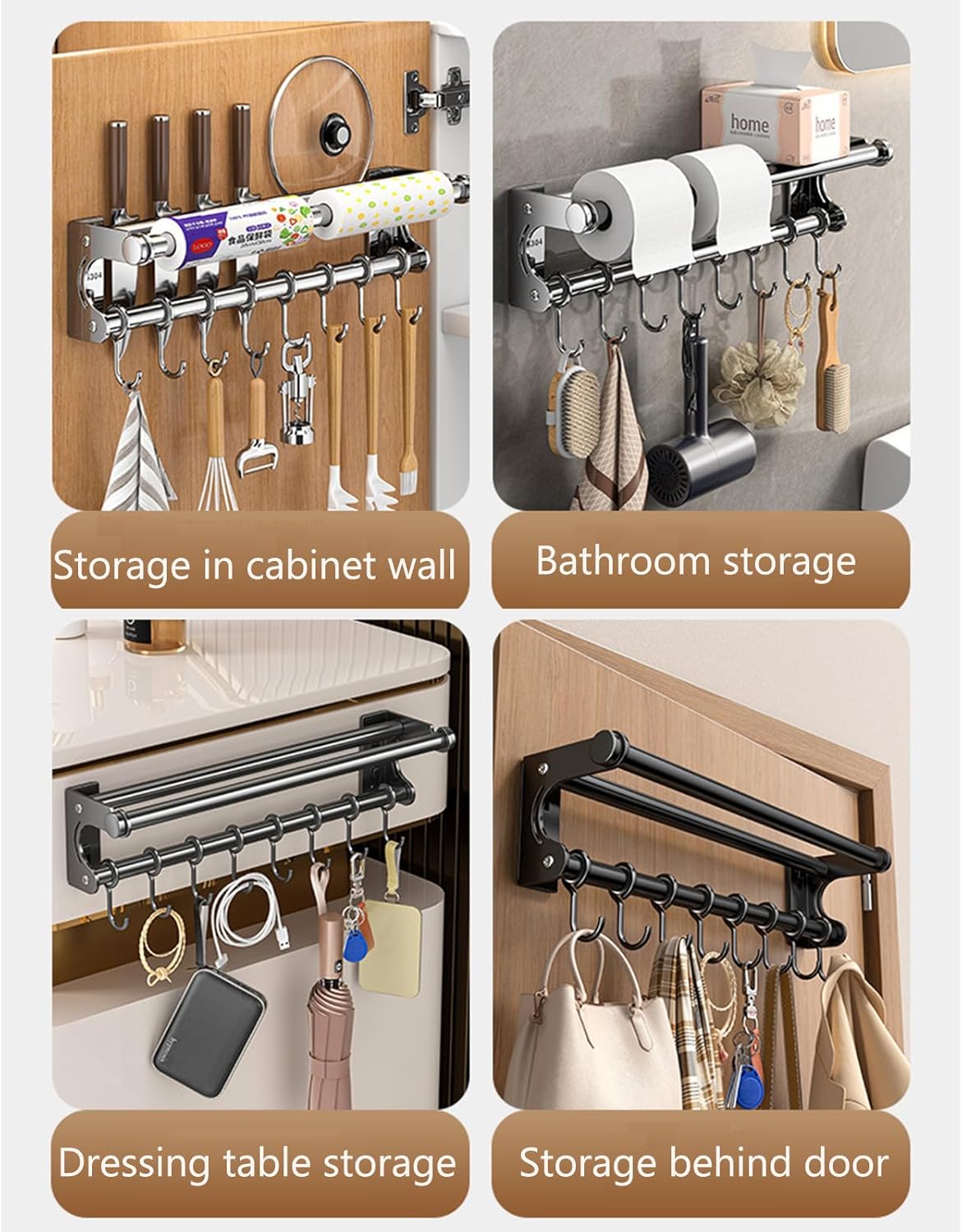 1.Multipurpose Storage:This kitchen organizer storage wall mounted consists of a hooks, knife rack, towel bar, and spoon/fork holder, all in one piece, to fully satisfy your need for a tidy kitchen. The kitchen organizer storage hanging can store cutlery, lids, towels, plates, pans and kitchen gadgets. The kitchen utensil hanger has hooks underneath, perfect for hanging pans, coffee cups, rags, brushes and more.