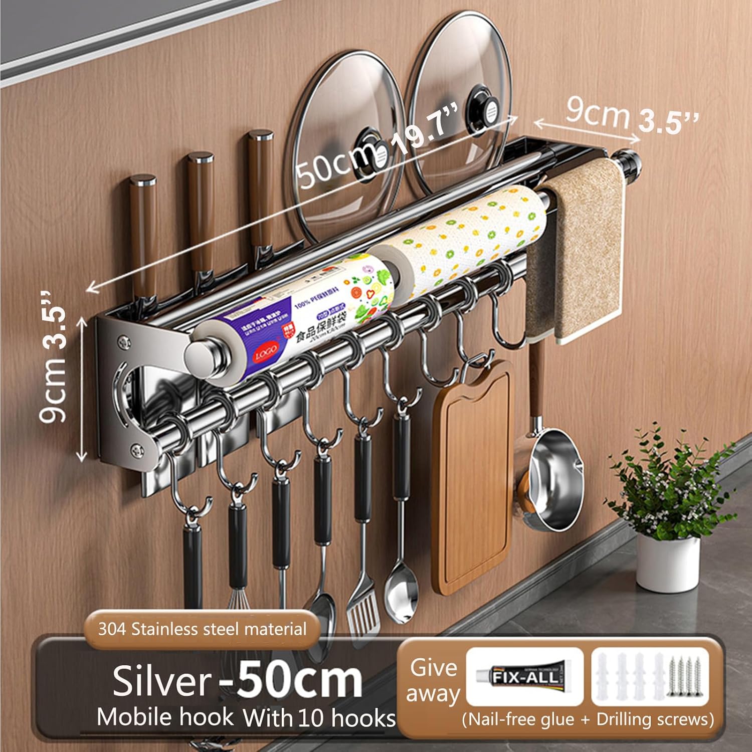 Hanging Wall Mount knife Wall Mount, Space-Saving Knife Rack with Hooks, Kitchen Organizer Storage Shelf for Utensils Spatula Spoon, Kitchen Utensil Hanger (Silver, 50CM+10Hooks)