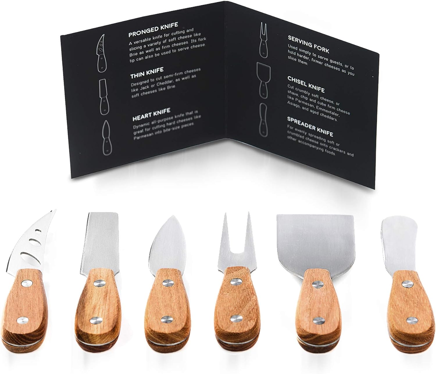 🔪 COMPLETE 6-PIECE COLLECTION: This Cheese Knife Set includes 4 specialized cheese knives, 1 cheese fork, and 1 cheese spreader knife—everything you need to serve your favorite cheeses on a stunning cheese board. PLUS, enjoy 15 delectable Cheese Recipes for every occasion!