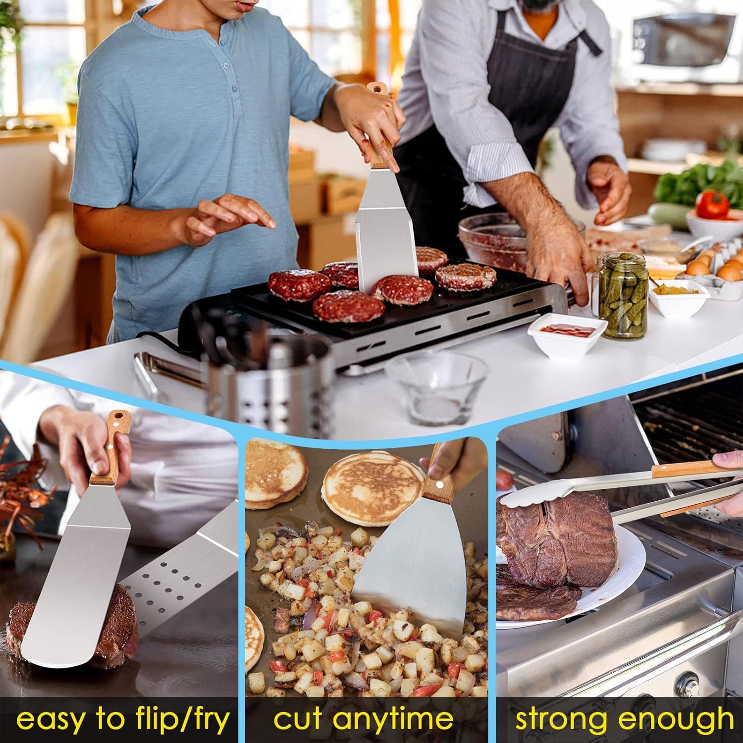 SAVE TIME & ENERGY – Featuring beveled edge make turning, lifting, and cooking much easier, Griddle scraper is sharp enough for great cutting, chopping and scraping food residue anytime, Perforations design reduces excessive grease, BBQ tong can control delicate food much better