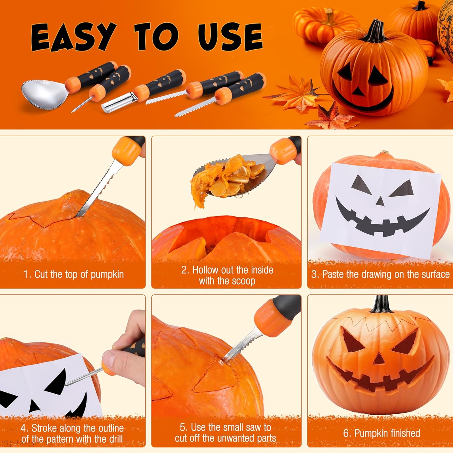 Perfect Halloween Gift: Presented in a Halloween-themed box, our 5-piece pumpkin carving set is not only functional but also a fantastic gift idea. Whether for a seasoned pumpkin carver or someone trying it out for the first time, this kit will help them create unforgettable Halloween decorations.