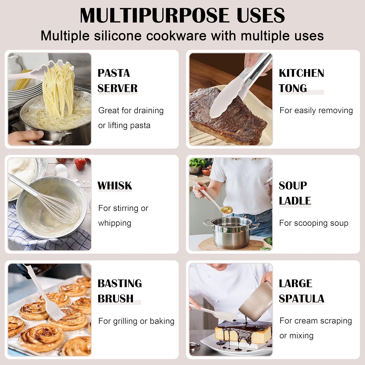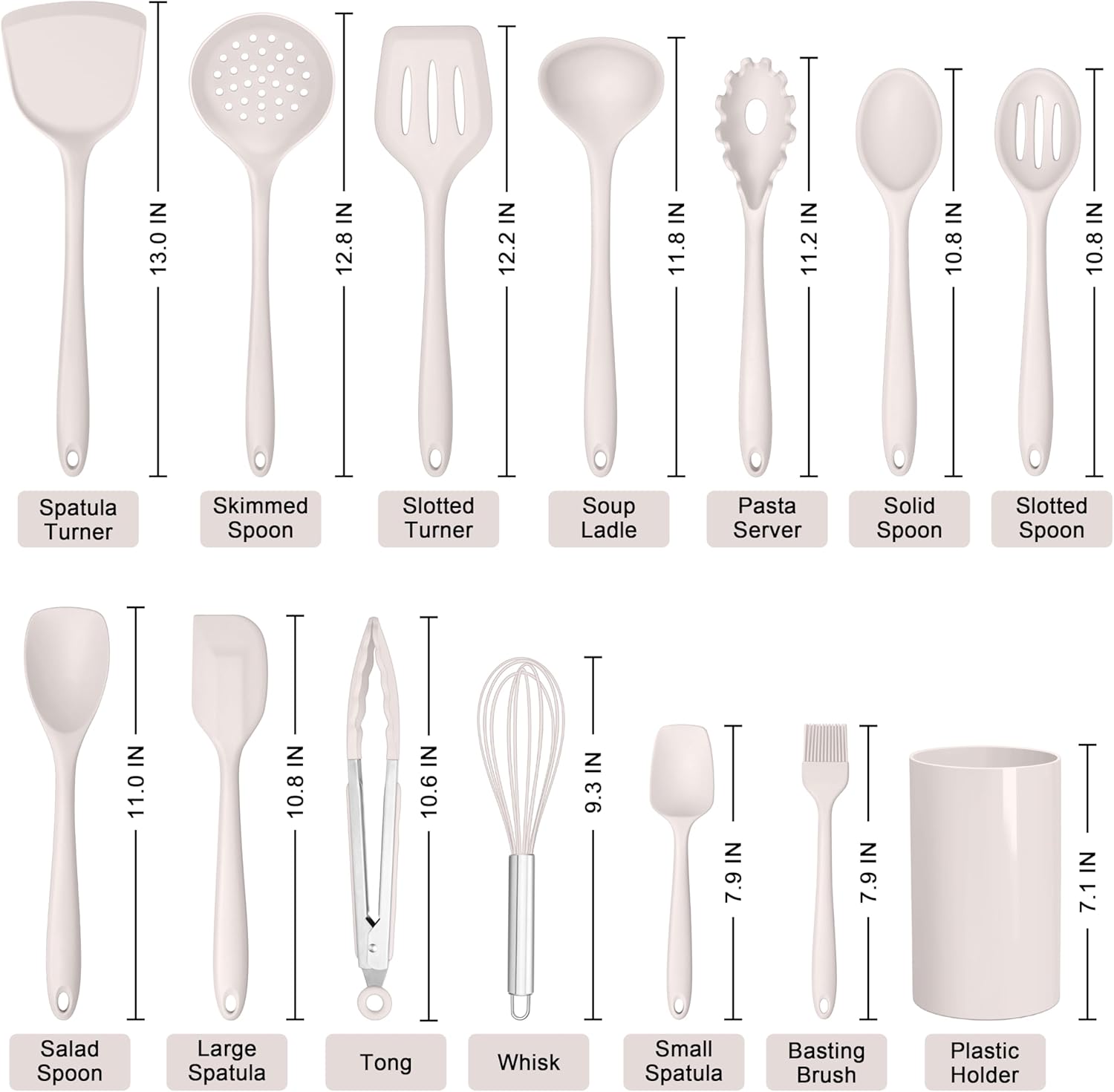 COMPLETE 14-PIECE SILICONE UTENSIL SET: Our kitchen utensils set includes Spatula turner, Skimmed spoon, Slotted turner, Soup ladle, Pasta server, Solid spoon, Slotted spoon, Salad spoon, Small spatula, Basting brush, Large spatula, Egg Whisk, Kitchen tong, Plastic holder, Also a thoughtful gift for Mother’s Day, Christmas, New Year’s, Housewarmings, Wedding and etc, Modern minimalist look with smooth lines to complement your kitchen, a practical kitchenware must haves