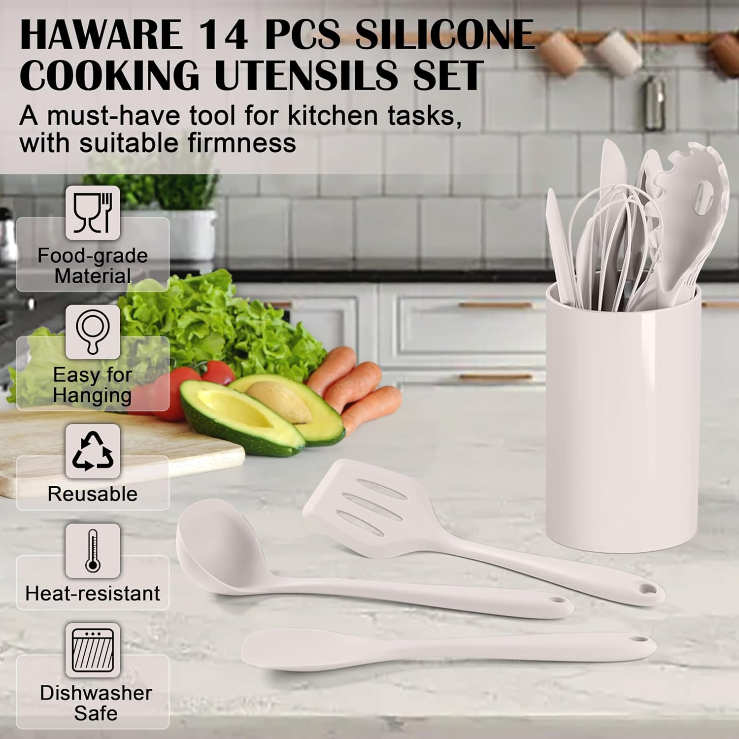 HaWare Kitchen Utensils, 14 PCS Silicone Cooking Utensils Set, Heat Resistant Kitchen Utensils for Non-stick Cookware, Kitchen Gadgets Tools with Spoons, Spatulas, Whisk, Dishwasher Safe (Khaki)