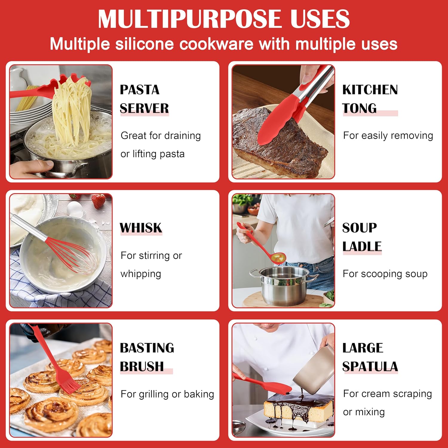 HEAT-RESISTANCE AND NON-STICK: The silicone cooking utensils set is soft and scratch-resistant, prevents scratches inducing on non-stick cookware surfaces, Also they are heat resistant, not easy to bend, melt, or wrap under high temperature, could meets all you kitchen cooking demands for stirring, scooping up, mixing, baking, cooking, whisking, basting, frying or serving