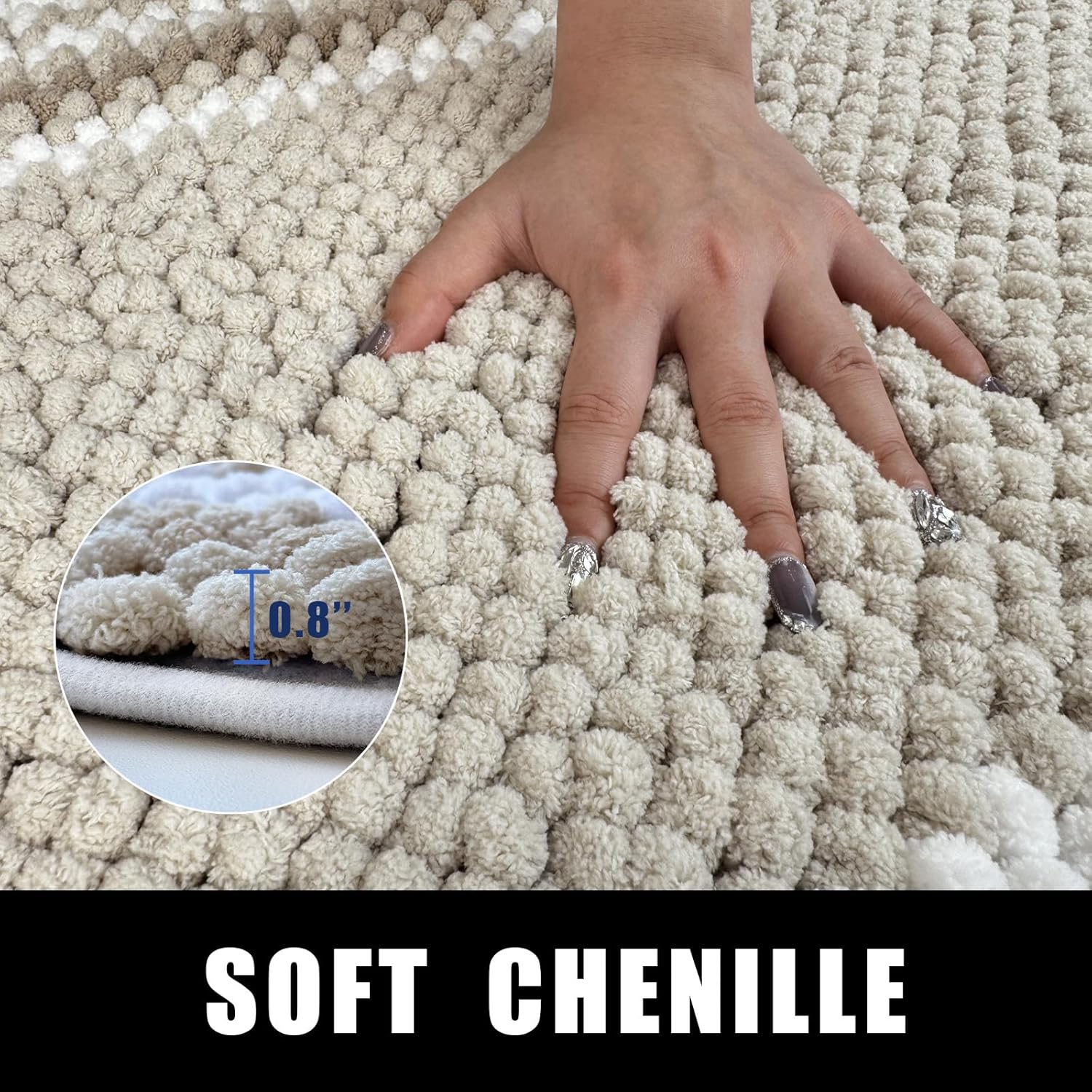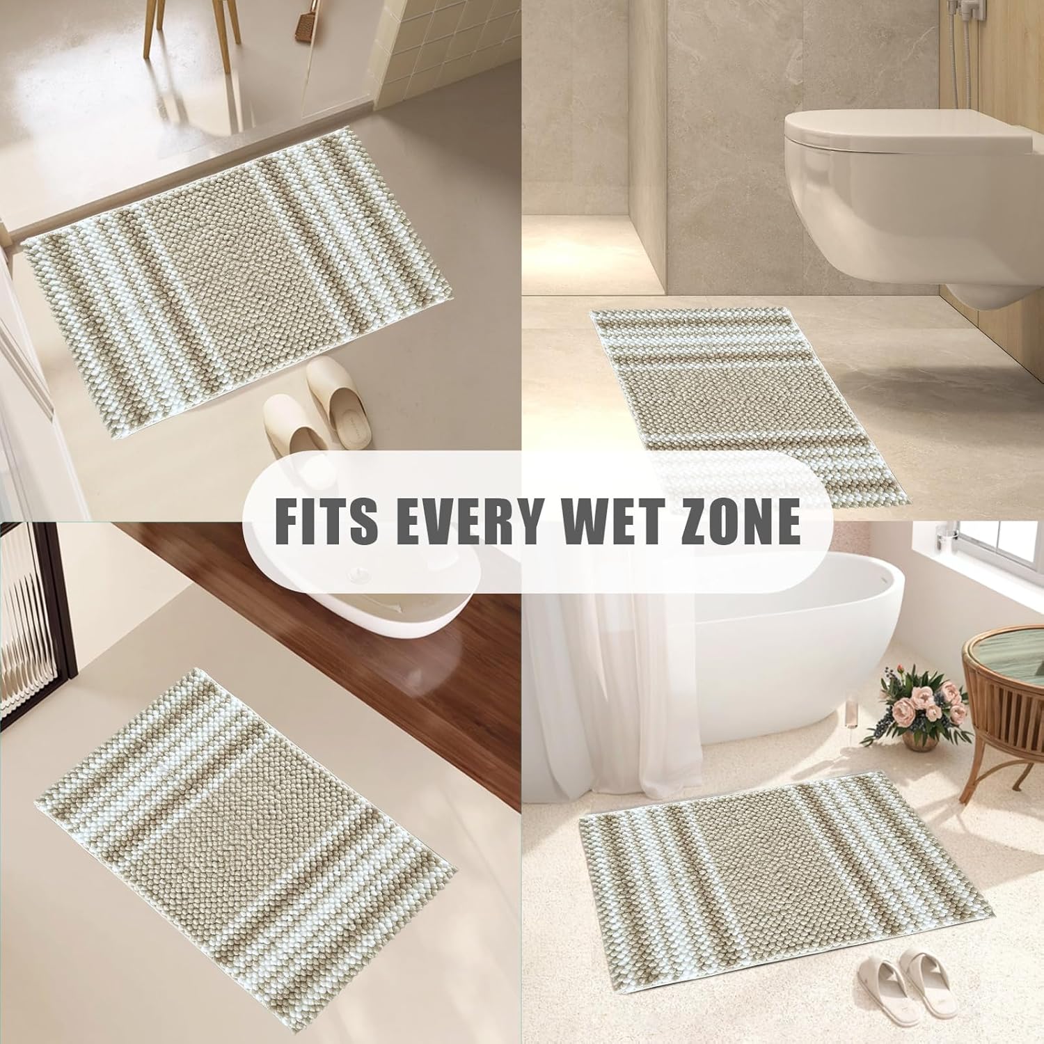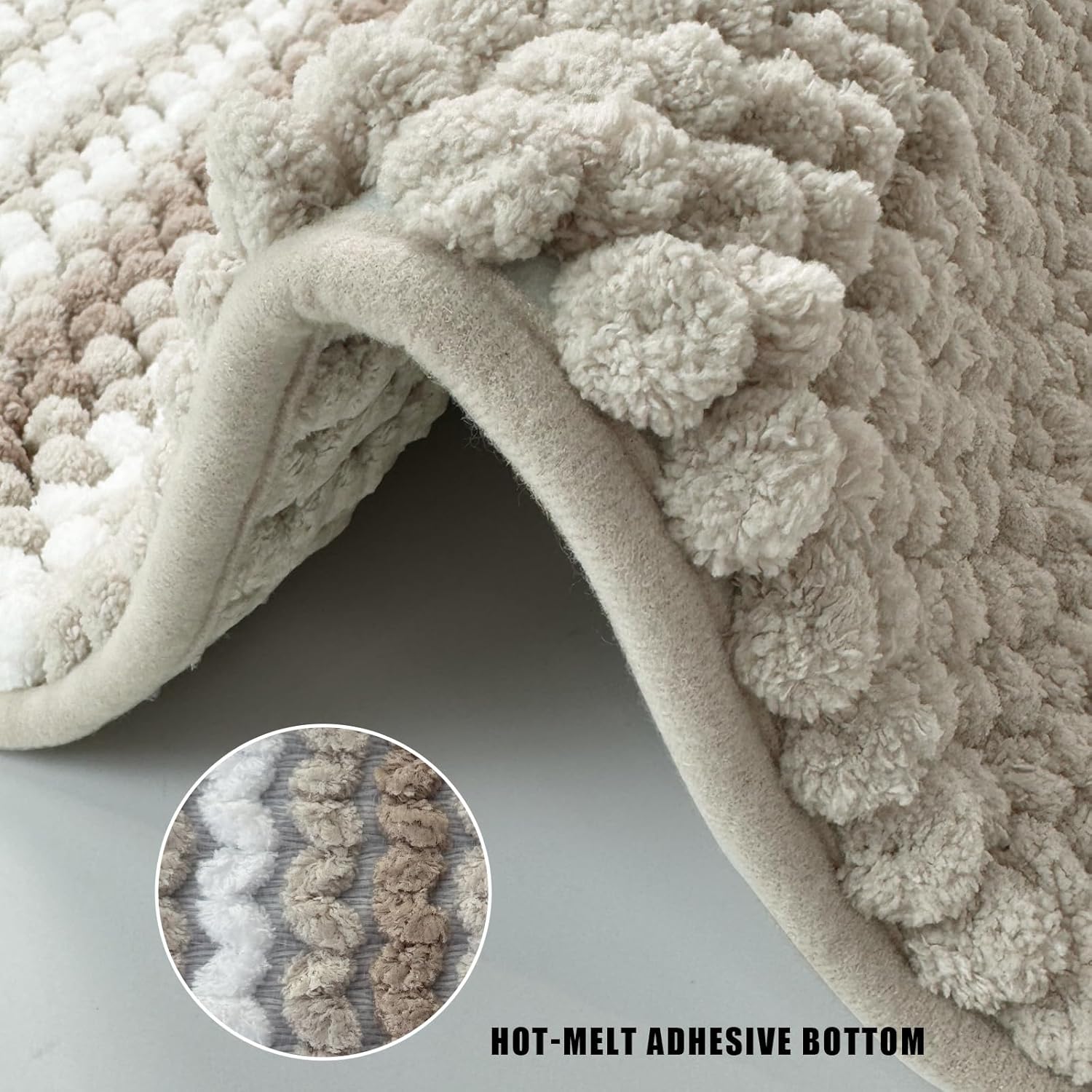 ODOR-FREE SUPER ABSORBENT DESIGN. Chenille bathroom rug soaks up water instantly, paired with non-slip hot melt base that never smells like rubber. Unlike PVC mats, it stays fresh through steamy showers without chemical odors