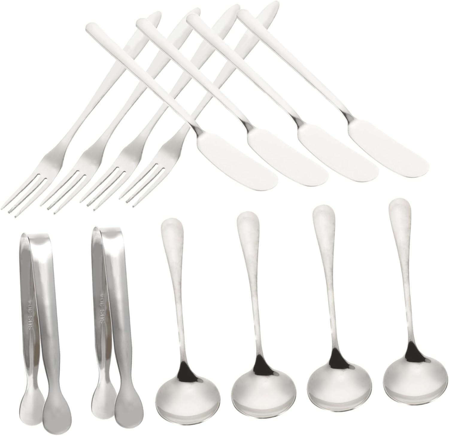 4 x Spreader Knives 4 x Spoons 4 x Forks 2 x Mini Serving Tongs