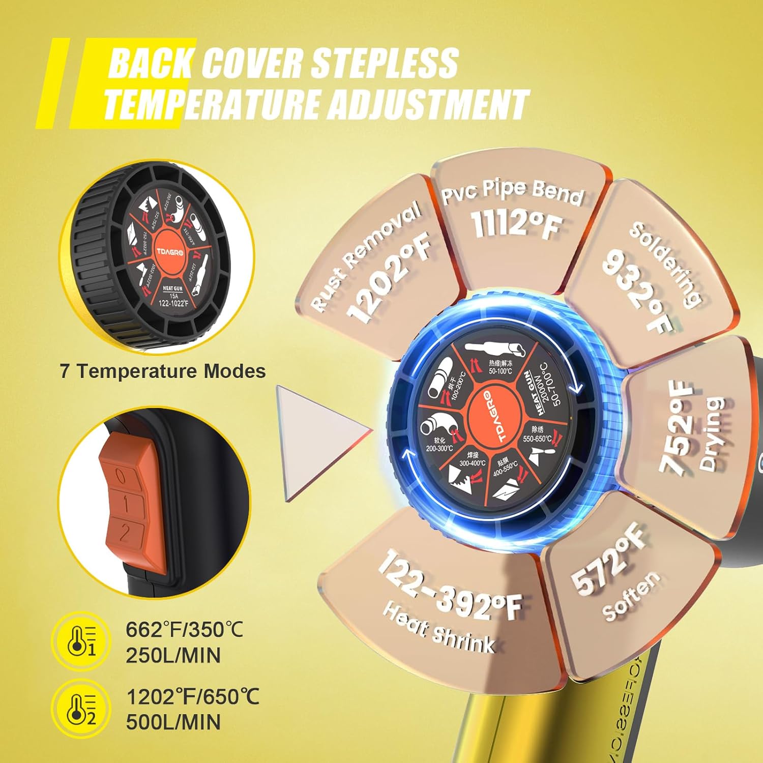 ✅【1800W Strong Power & Fast Heating】 1800W heating motor allows TDAGRO heat gun heat up in 1.5 seconds, within a short time high temperature can reach Max out at 1202℉,which helps increase the efficiency of the project and saves a lot of time.