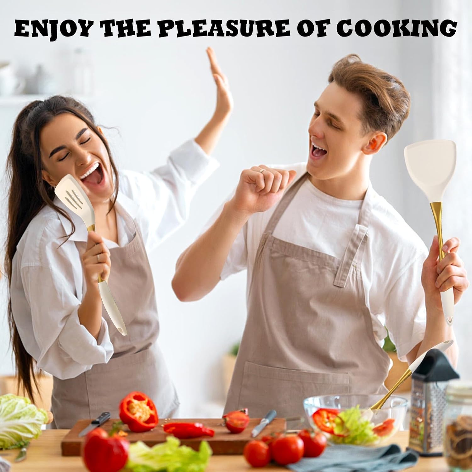 Introducing our premium Silicone Spatula Set, designed for the discerning home chef who values both functionality and style. Crafted from heat-resistant, food-grade white silicone, this 2-piece spatula set ensures safe and effective cooking for a variety of dishes, including stir-fries, steaks, fish, eggs, and pizza.The spatulas feature ergonomically curved, golden stainless steel handles that not only provide a comfortable grip but also add an elegant touch to your kitchen. The chic combination of the gold handle with the sleek white silicone gives these spatulas a modern aesthetic, making them a stunning addition to any kitchen decor.Perfectly suited for nonstick cookware, our silicone spatulas are BPA-free and non-toxic, ensuring peace of mind while you cook. Elevate your culinary experience with our Silicone Spatula Set—where practicality meets sophistication. Ideal for those who seek durable, stylish, and heat-resistant kitchen tools. Experience the difference in every meal you prepare!