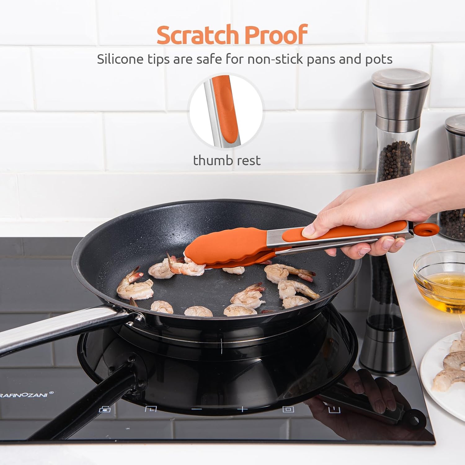 [Heat Resistant Silicone Tips without Melting & Odor] The silicone tipped tongs are made of Food Grade silicone, which is more Sturdy and has higher heat resistance (up to 480℉) than the basic. The silicone tips make them a great partner for your nonstick pans and pots. No more sharp tips to scratch or ruin your cookware. They are heat resistant, so no more silicone parts of the tongs melt off with heat again! Thanks to fine workmanship, the silicone tips firmly sealed on never lose its grip.