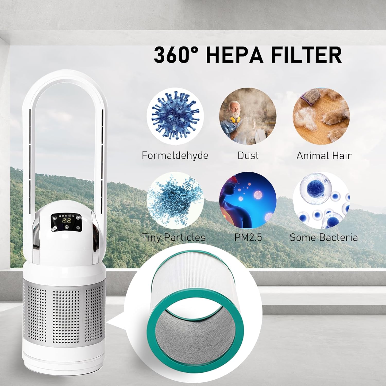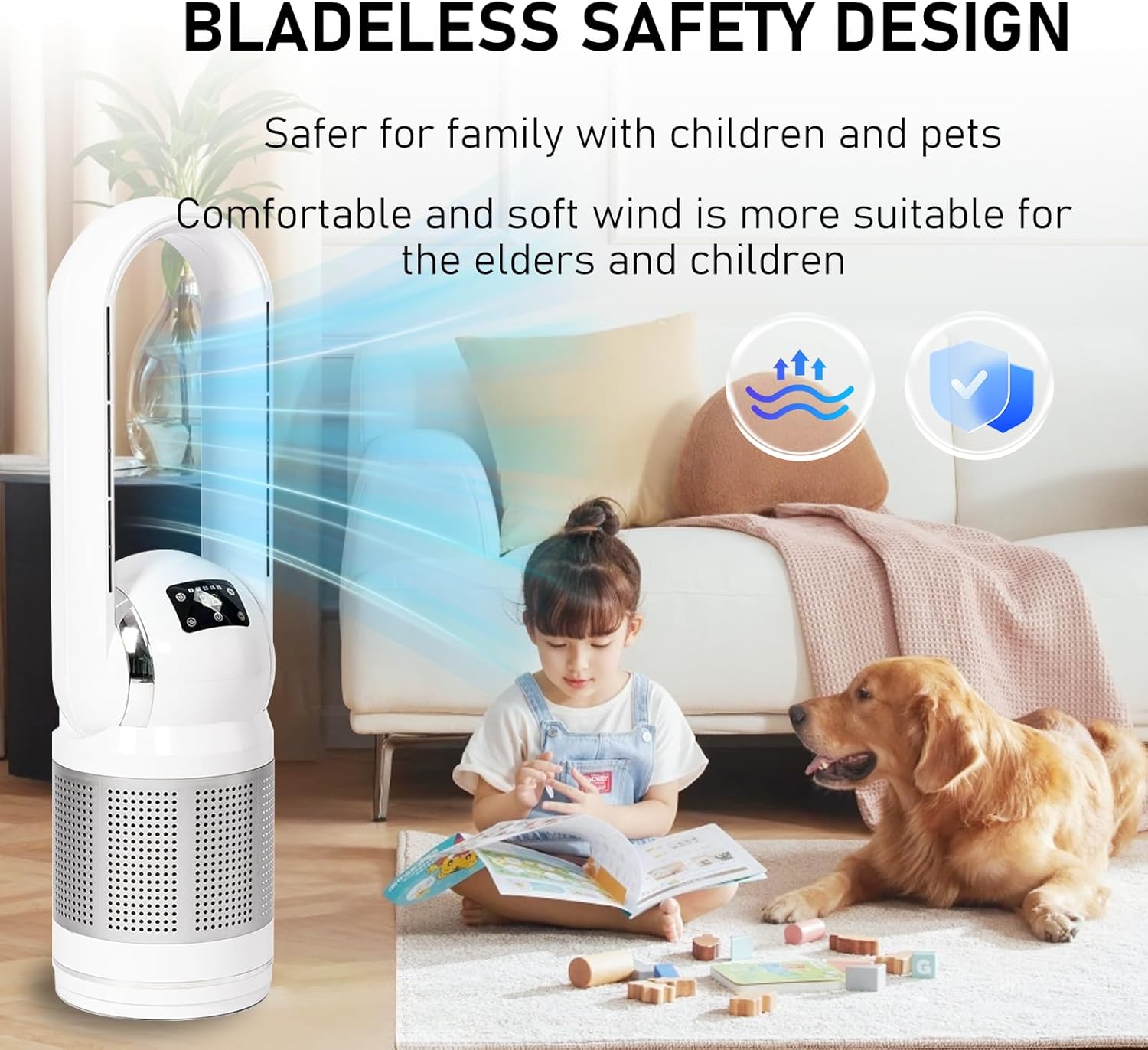 HEATIT Bladeless Fan with Remote and Air Purifier Tower Fan 80° Oscillating with 8 Speeds 8H Timer Air Circulator Fan HEPA Filter with PM 2.5 for Home Bedroom Kitchen and Office White