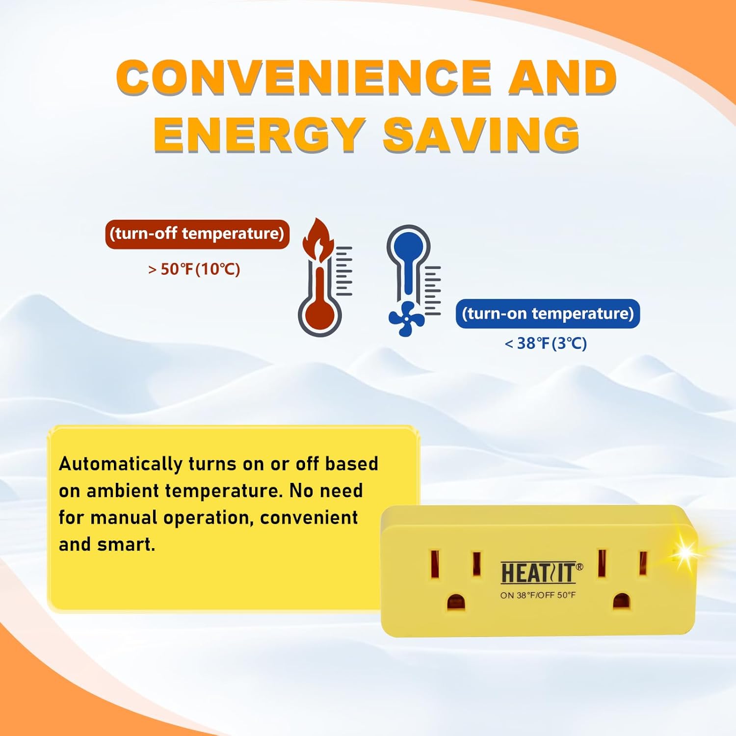 Energize below 38℉(3℃) and to turn off automatically at approximately 50℉(10℃). Automatically turns power on and off according to ambient temperature. Save energy and save money.