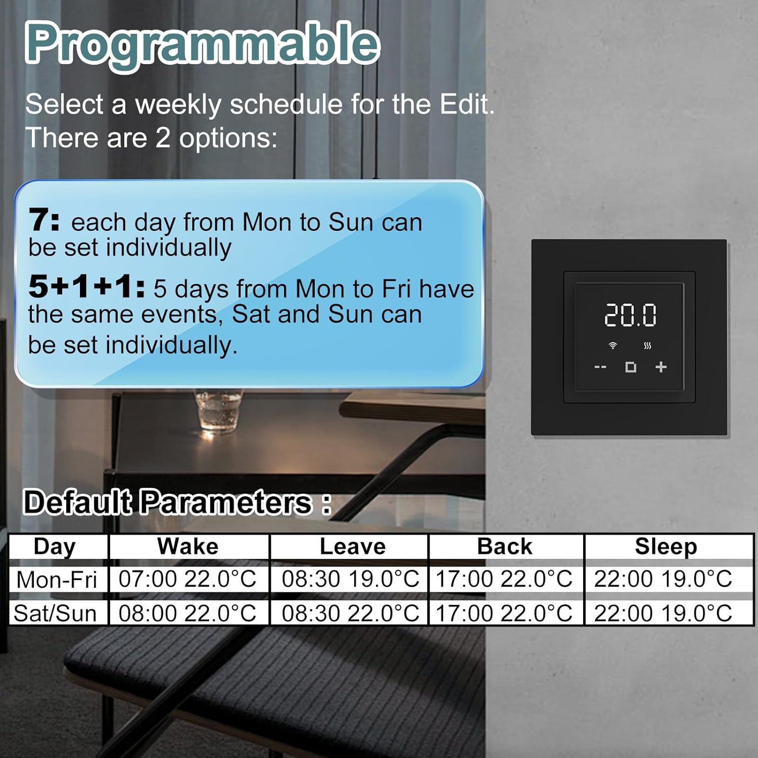 【 Sleek Design & DIY-Friendly Installation】The touchscreen blends seamlessly into modern home decor. Includes floor sensor, clear manual. Child Lock, Vacation Mode, and Open Window Detection add everyday convenience