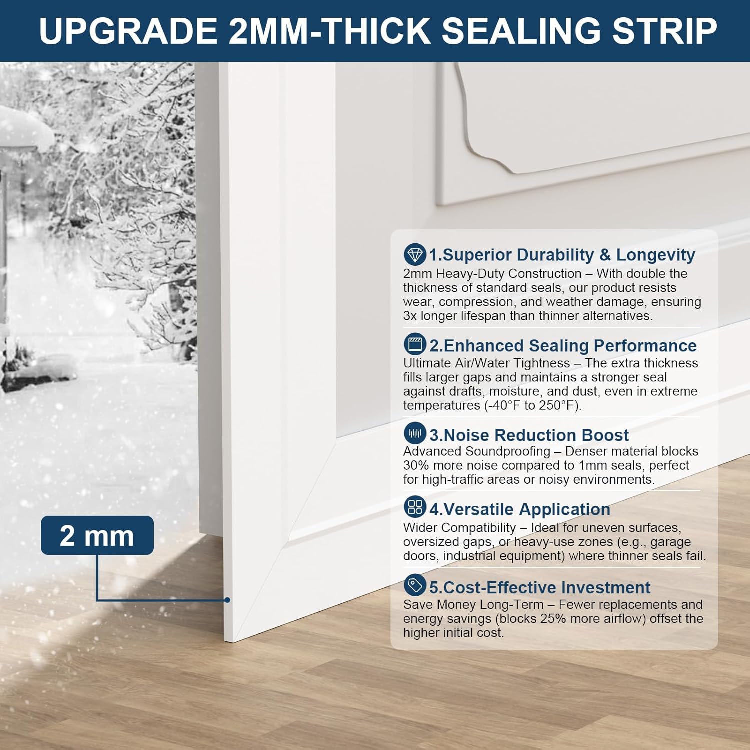 Specifications & Custom Fit: Length: 36 ft – Cut to any size for a perfect fit. Thickness: 0.08(5/64)” – Flexible yet durable for long-lasting use. Width: 2″ – Seals gaps up to 1″ effectively.