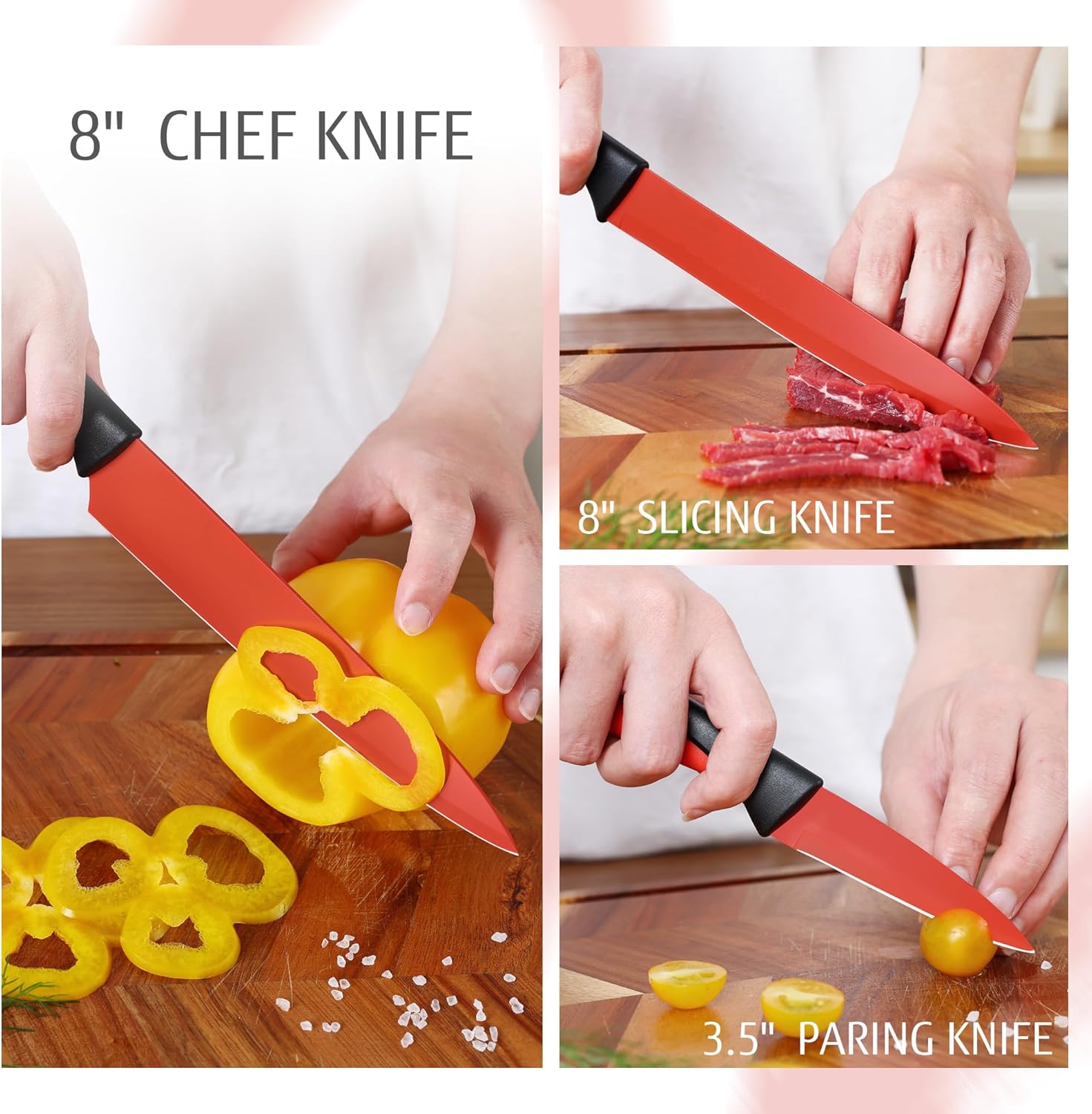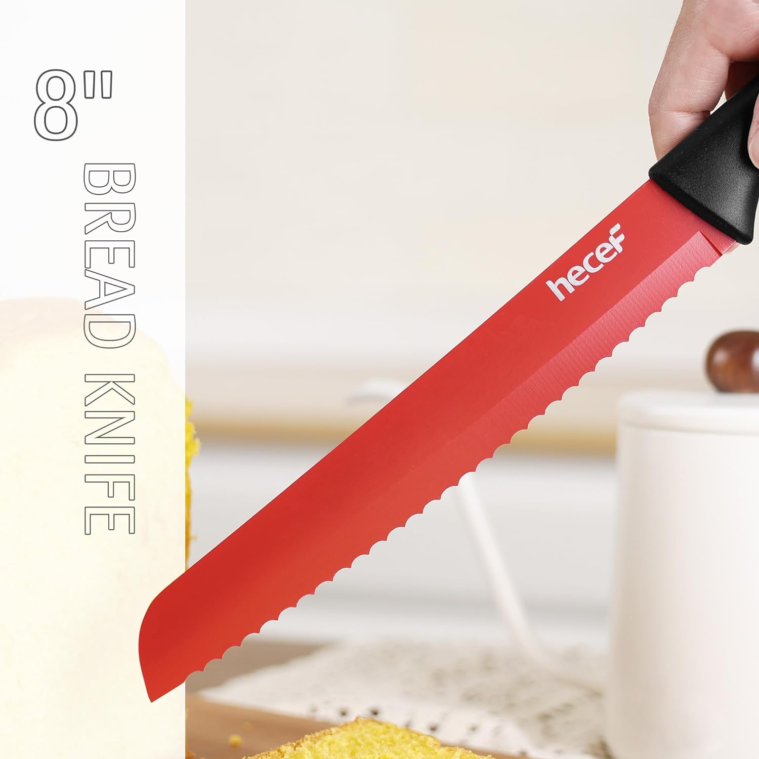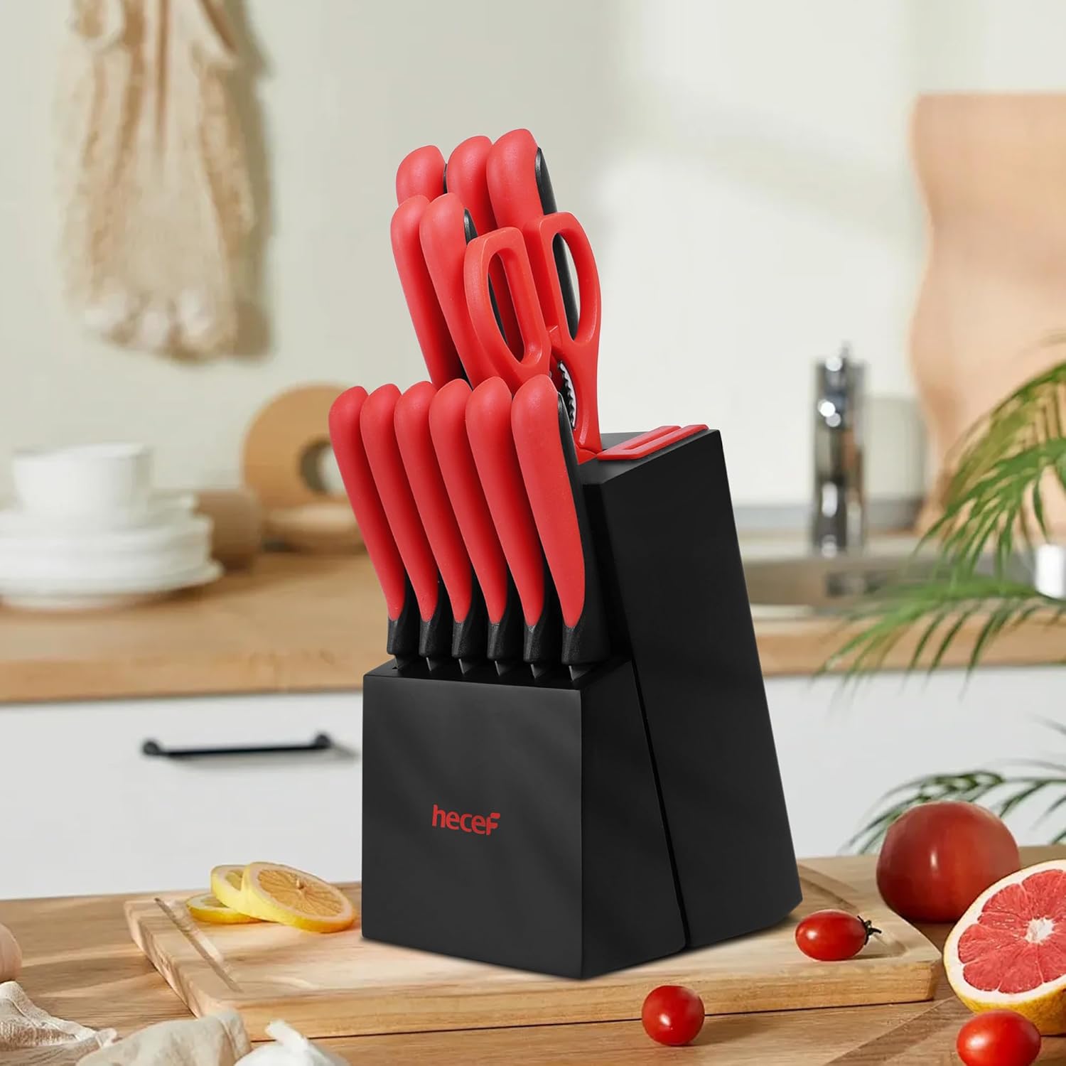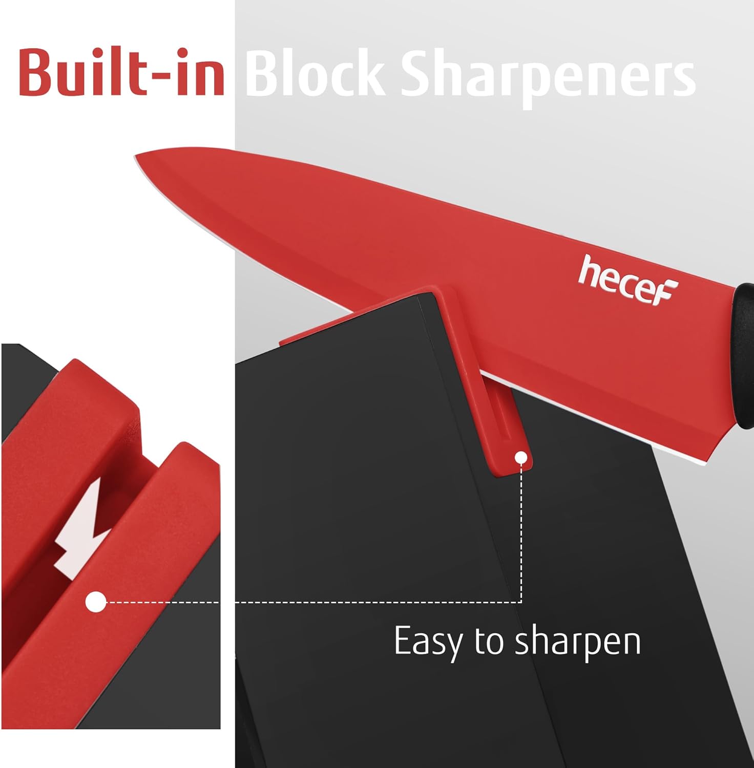 hecef 13 Pieces Kitchen Knife Set with Built-in Sharpening Wooden Block, Dishwasher Safe, High Carbon Stainless Steel Knife Block Set with Steak Knives, Kitchen Scissors, Red