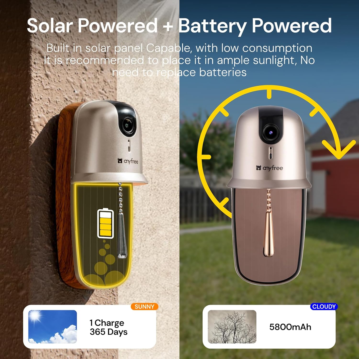 Solar Powered + Power Battery: Doorbell camera wireless Built in solar panel with low consumption model, long term using, recommended to place it in a sunny place (Please note: Solar charging only offsets regular motion triggers)