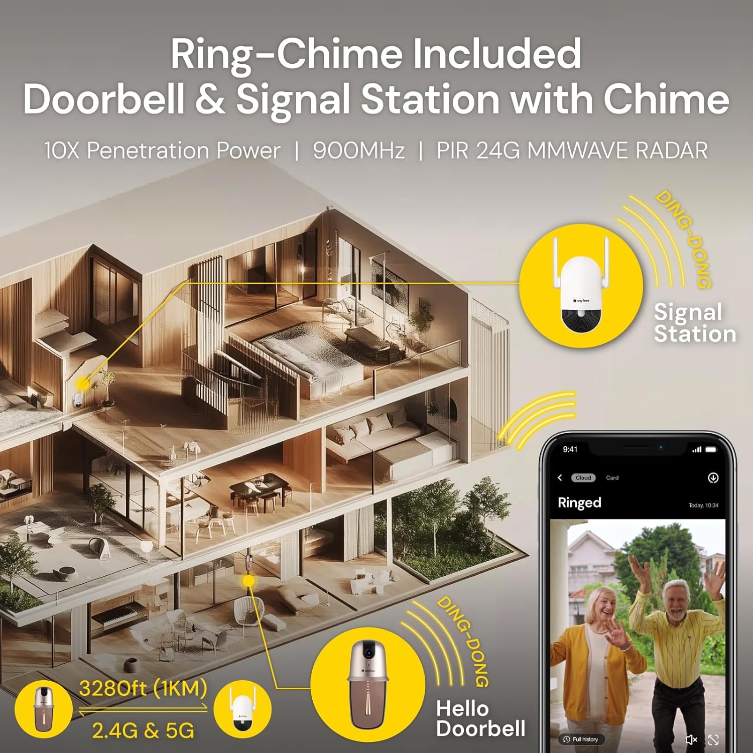 Doorbell Camera Wireless with Chime, Signal Station with Chime: Ultra-Long Distance Wireless Range, wireless doorbell camera offers a remote connection of up to 3280ft (1KM) and by using newest WIFI-Halow technology