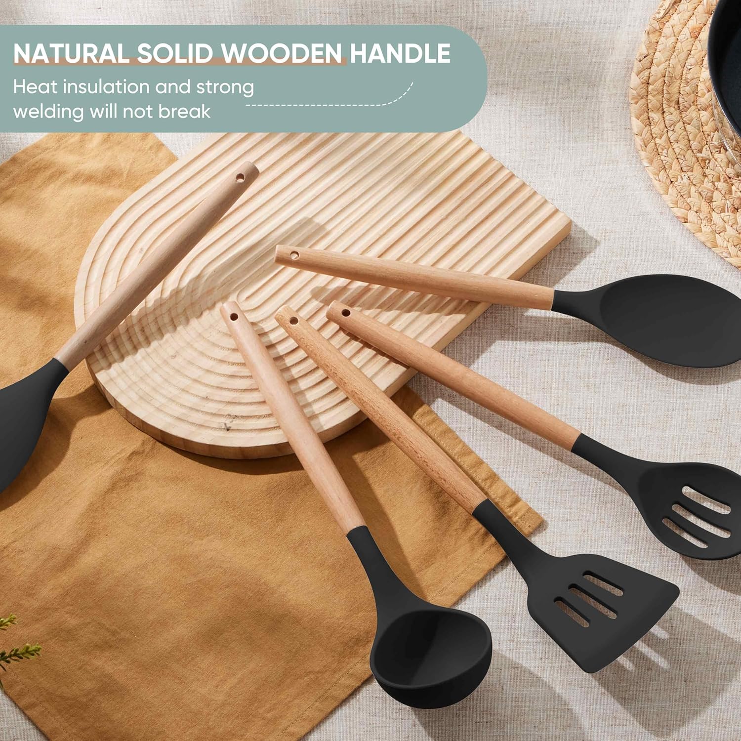 Herogo 5-Piece Cooking Utensils Set, Silicone Kitchen Utensils Set with Wooden Handle, Heat Resistant Cooking Tools Slotted Turner, Spoon, Soup Ladle, Spatula, Spoonula for Nonstick Cookware, Black