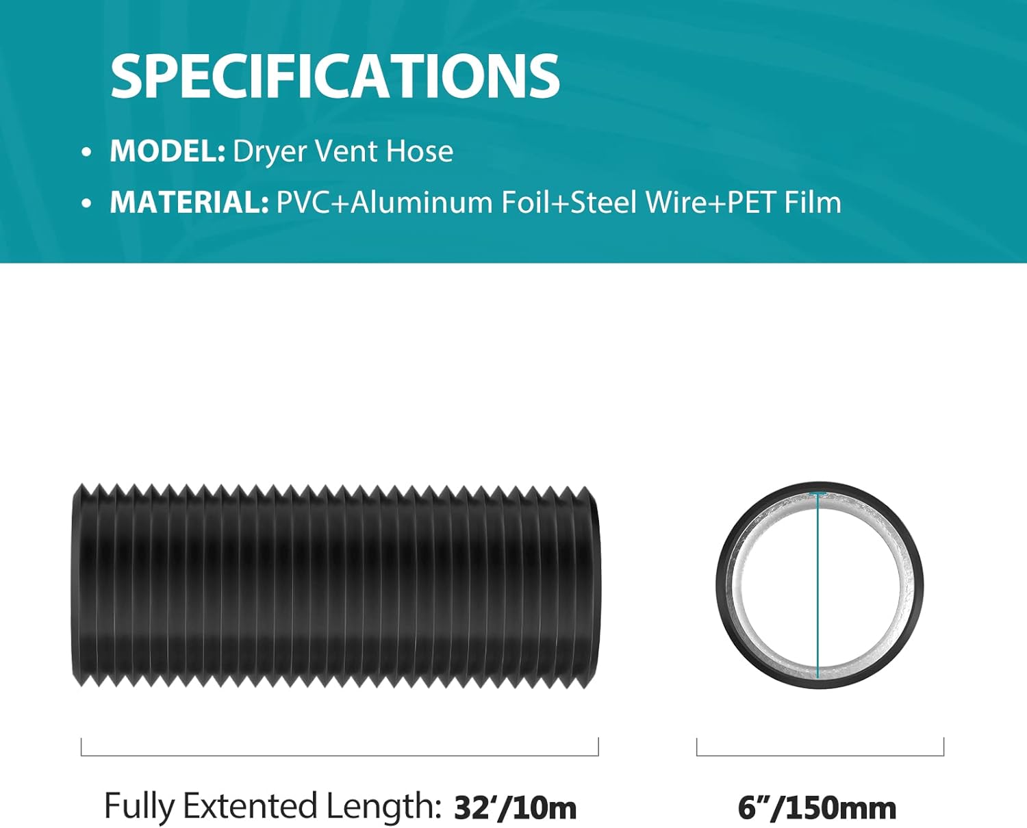 6 Inch Duct: The HG POWER flexible vent hose is 6 inch in inner diameter, the outer diameter measures 6.3 inch, and comes in one 32 feet, which can be cut to the required length.