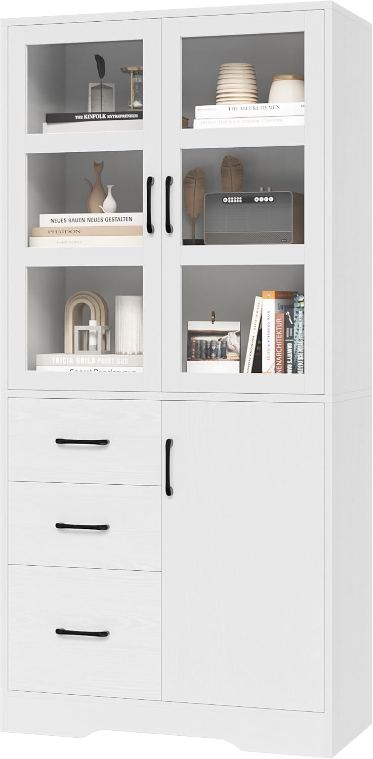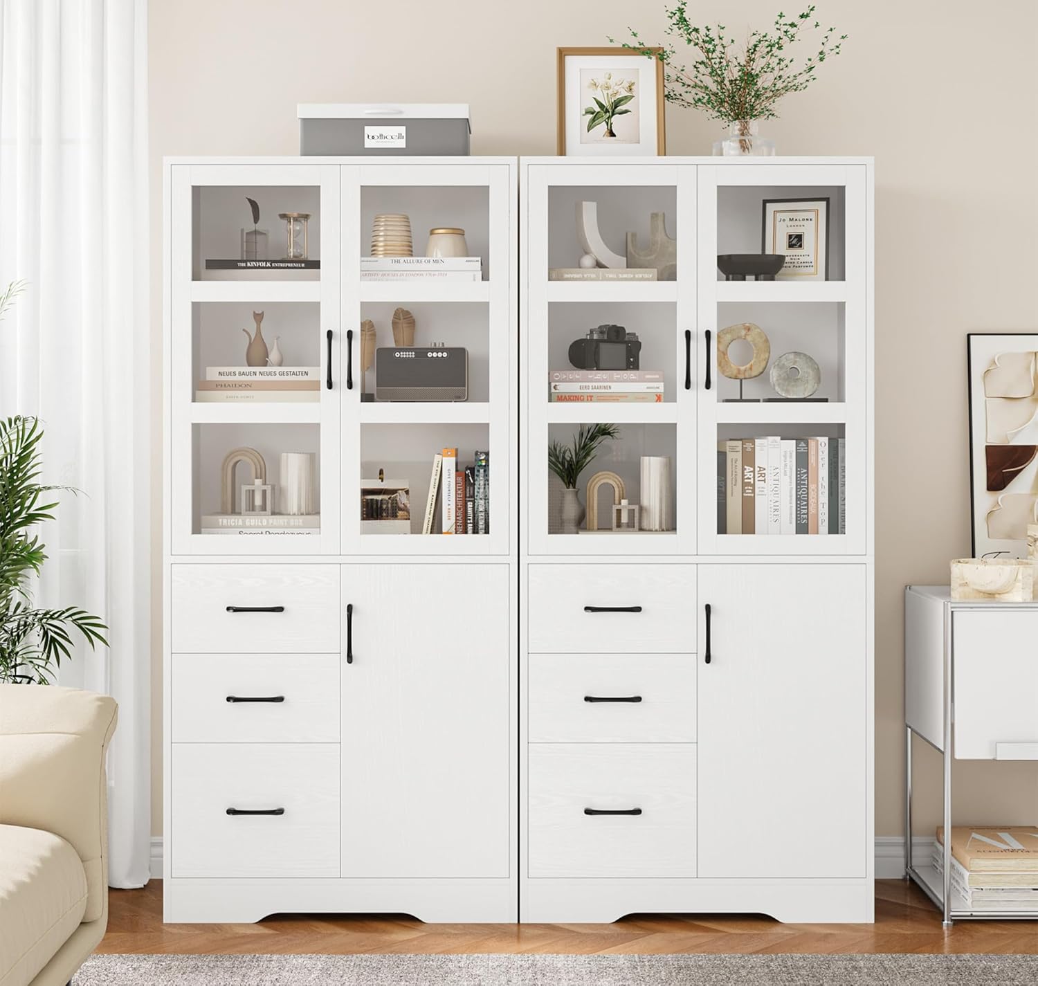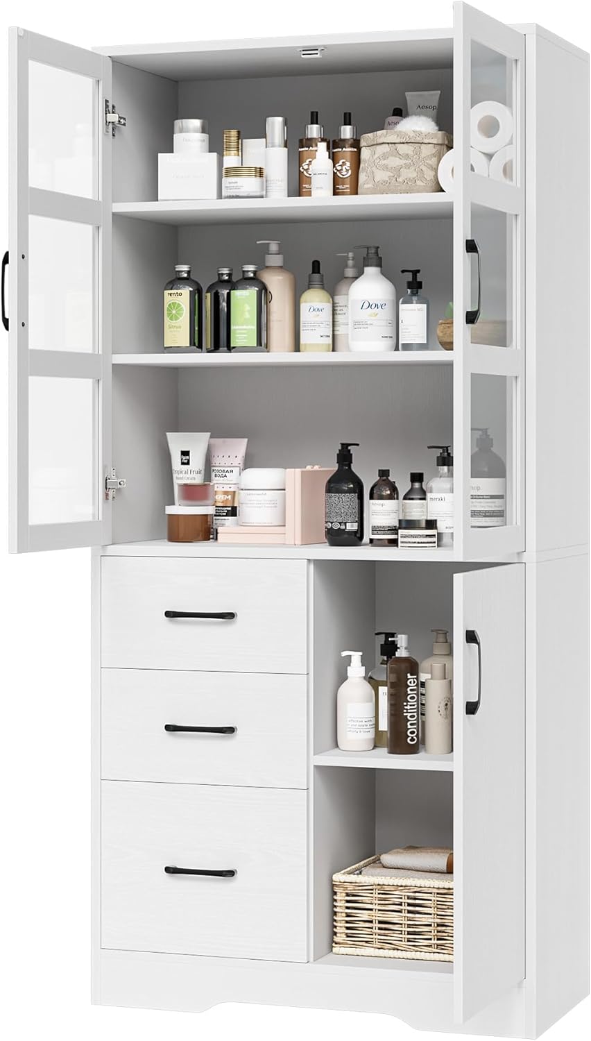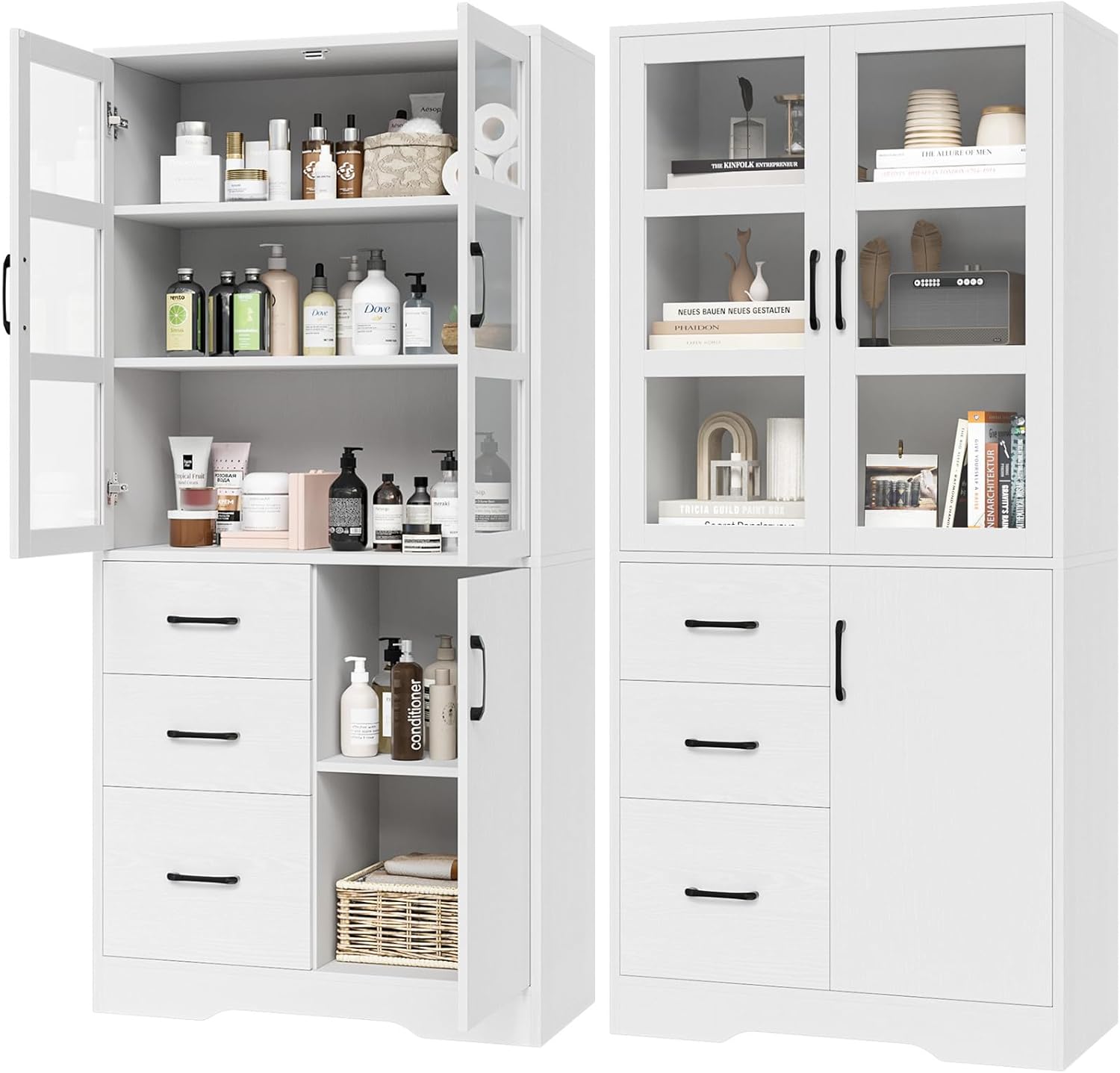 VERSATILE AND MULTIPURPOSE: With its elegant yet bright appearance and classified practical design, this white cabinet is suitable for various places: bathroom, living room, laundry room, kitchen, pantry, entryway, or any corner. Moreover, the top storage cabinet is equipped with two glass doors, allowing it to be used as a filing cabinet, display cabinet, or bookcase in a home office