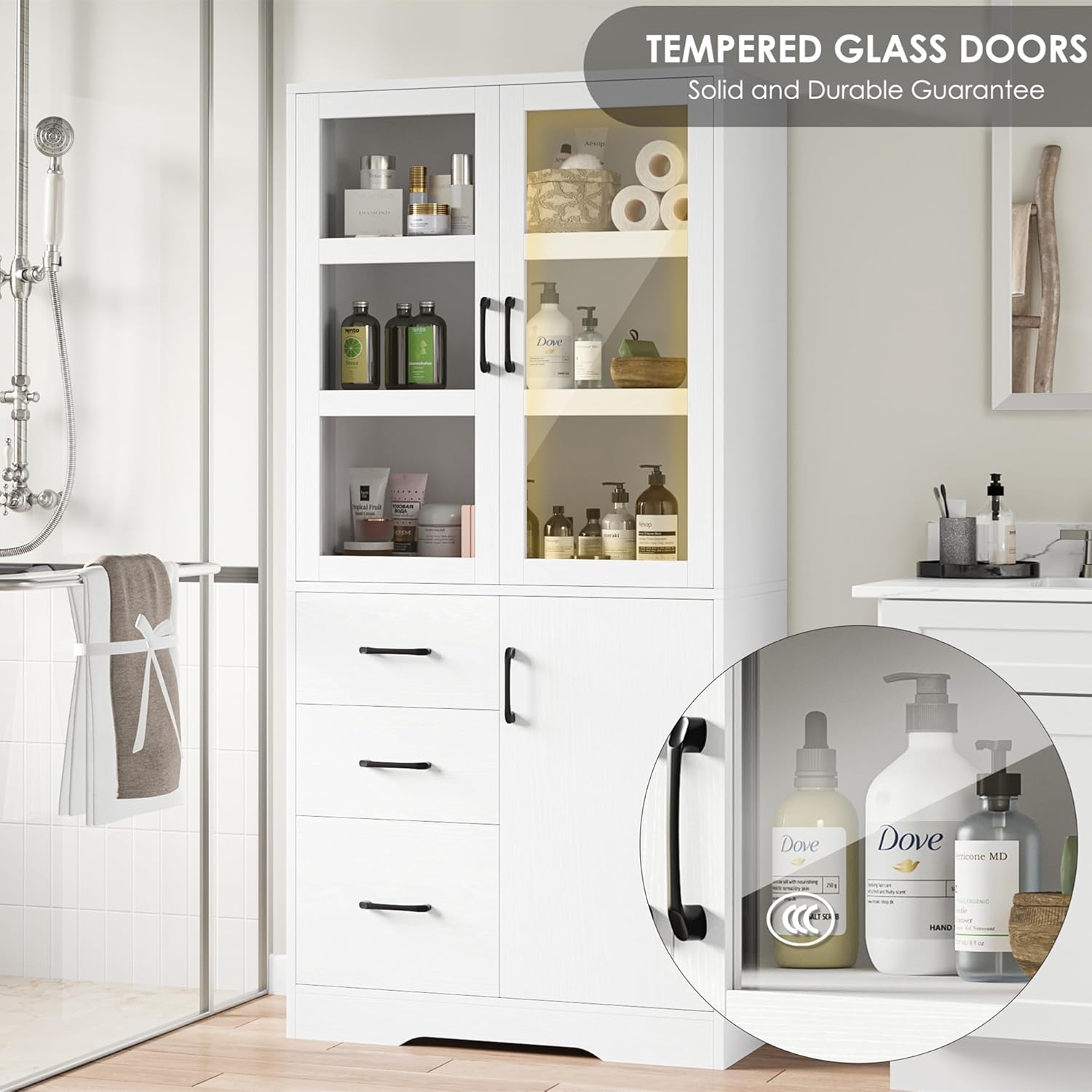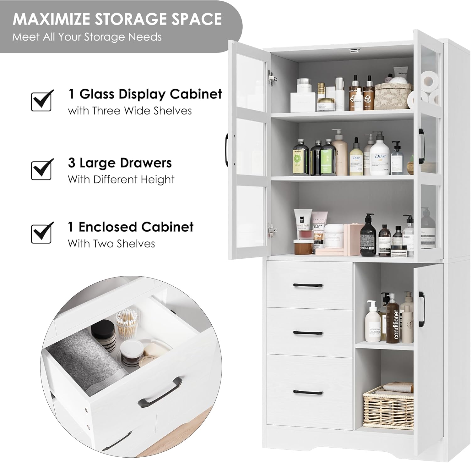 STURDY AND SAFE: This storage cabinet, made of high-quality engineered wood and coated with eco-friendly white finish, with doors, shelves, and drawers, is sturdy, waterproof, anti-corrosion, and built to last even in a moist bathroom. Its tempered glass door ensures durability and eliminates worries about breakage. Additionally, the two anti-tipping devices provide enhanced safety and stability (Weight capacity: 330LBS)
