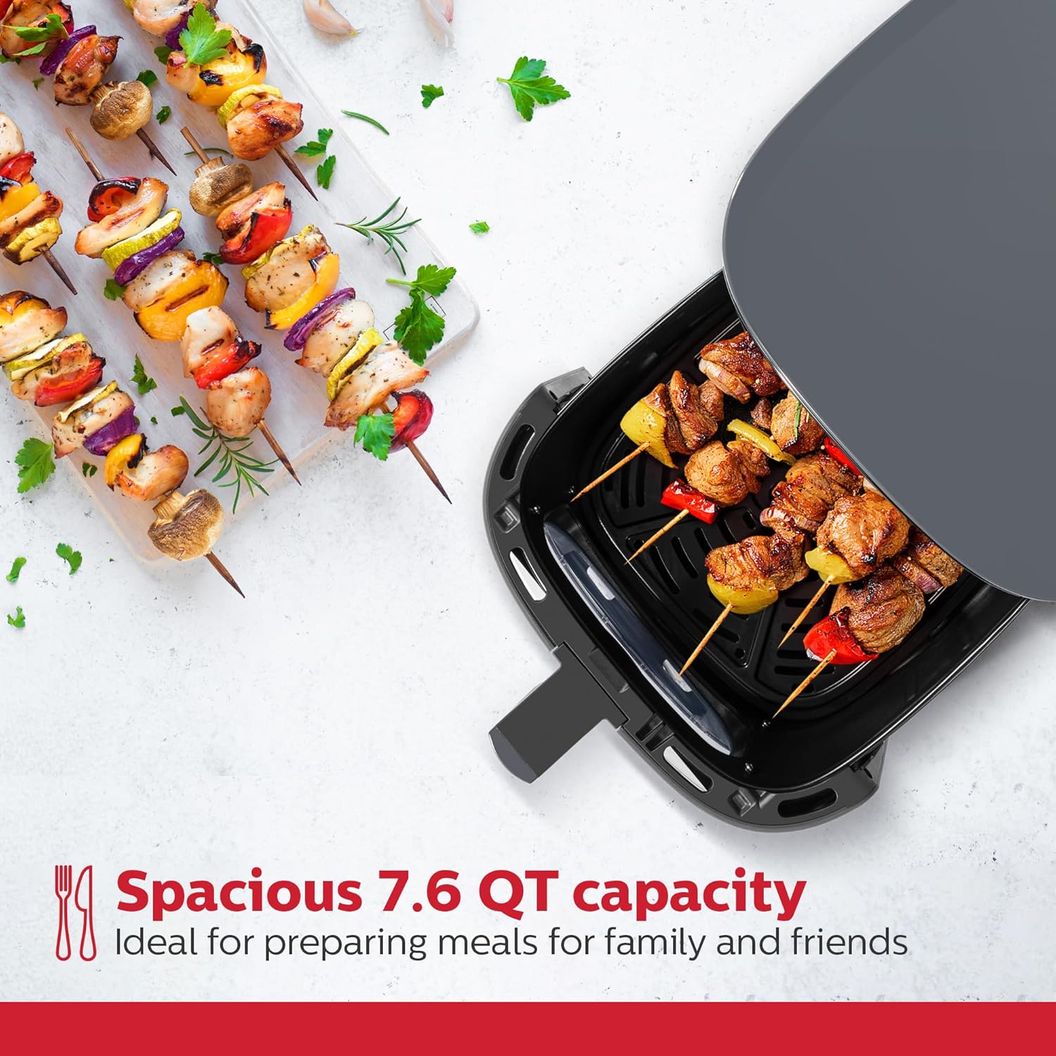 ADDITIONAL FEATURES: Digital easy touch control panel. 7 preset cooking options. 60-minute timer and convenient auto shut-off feature. 7.6QT removable dishwasher safe frying basket with non-stick coating. Cool touch handle for added safety.