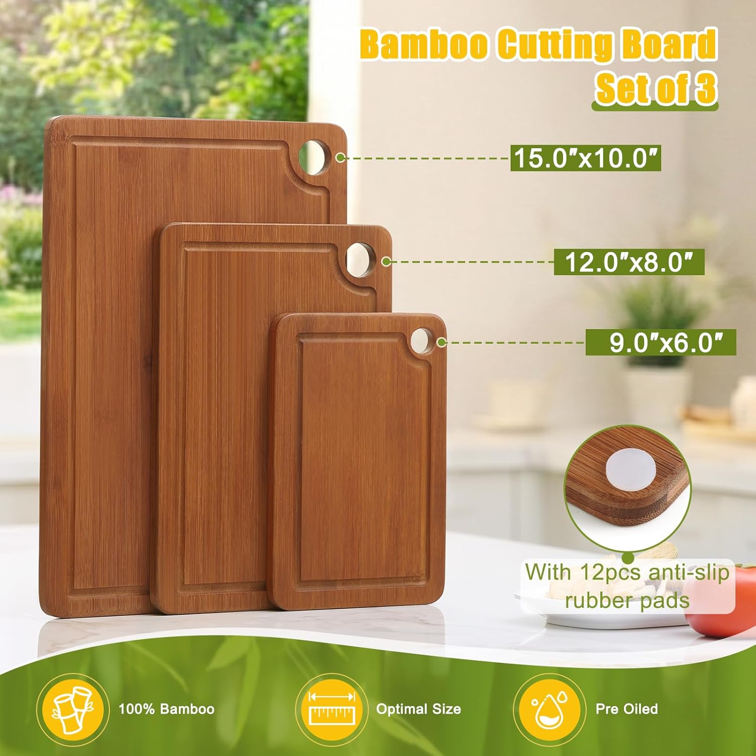 Versatile Sizes for Every Culinary Need: This bamboo cutting board set has 3 perfectly sized boards (15×10”, 12×8”, 9×6”) for all tasks. Large: handles roasts, whole veggies, family meals. Medium: great for daily chopping. Compact: ideal for small prep (herbs, garlic, nuts). All double as elegant cheese platters/appetizer servers—perfect for dinners, potlucks, casual gatherings