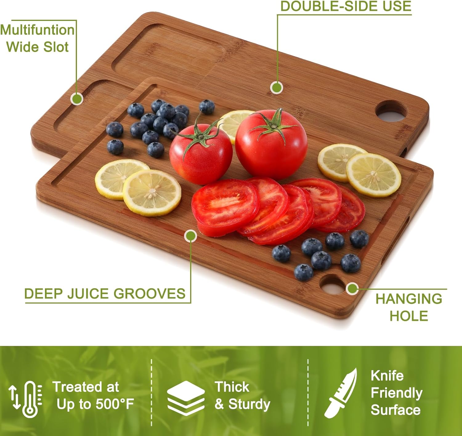 Deep Juice Grooves & Built-In Handles: Each wooden cutting board features dual-sided functionality. One side includes deep, widened juice grooves that catch excess liquids (from meats, fruits, or veggies) to keep your countertops mess-free. The other side offers a flat, spacious surface for general chopping. Built-in handles on all three boards make storage a cinch—hang them on hooks, tuck them in drawers, or stack them compactly