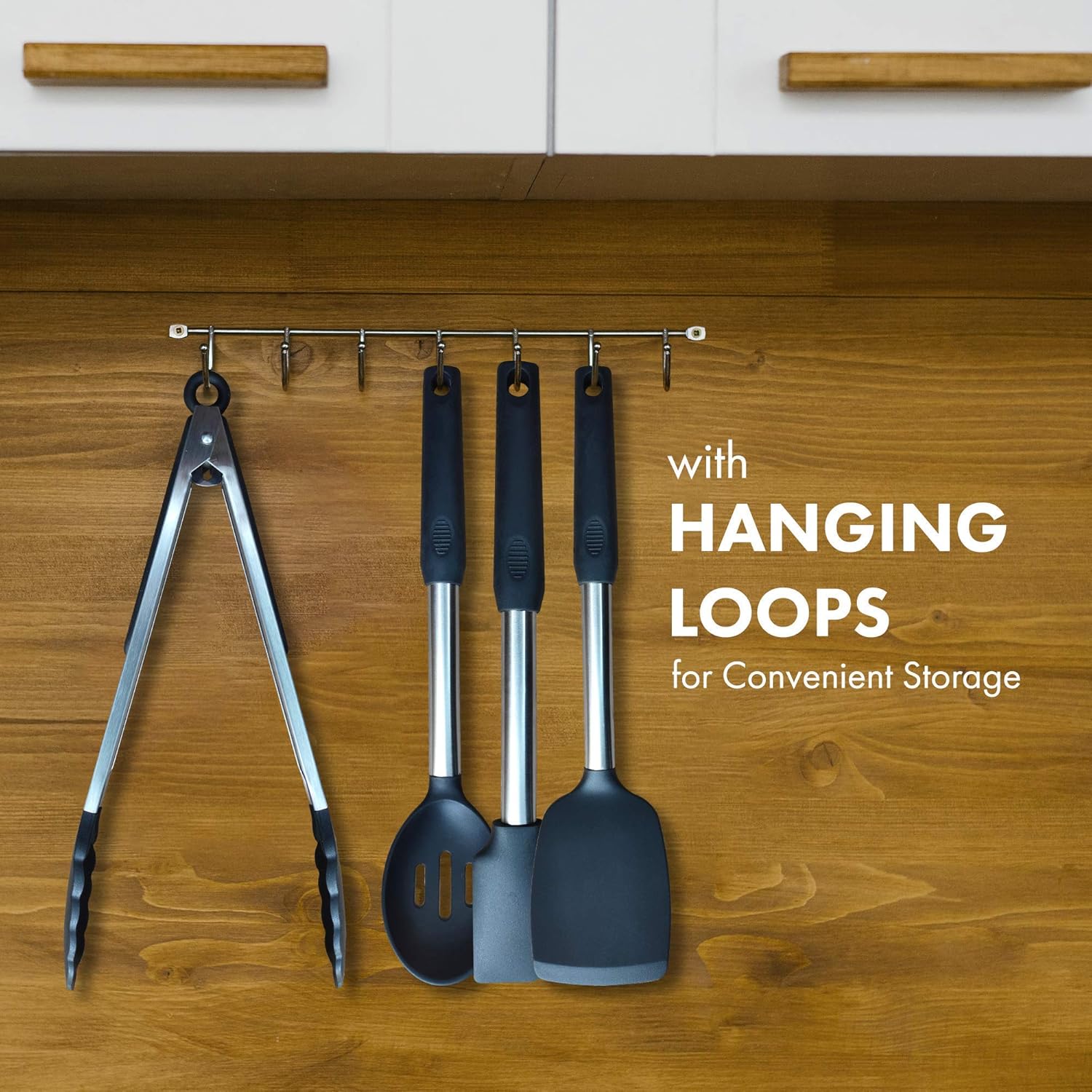 ERGONOMIC STAINLESS STEEL HANDLES: You can rest these kitchen utensils set against a hot pan without worrying about the handle burning. This silicone cooking utensils set has an ergonomic 430 stainless steel handle for easier handling and better reaching. The plastic of this silicone utensils for cooking set has added nylon fiber for reinforcement. Each of the cooking utensils is equipped with hanging loops at the end of the handles to easily hang on a kitchen rack when not in use.