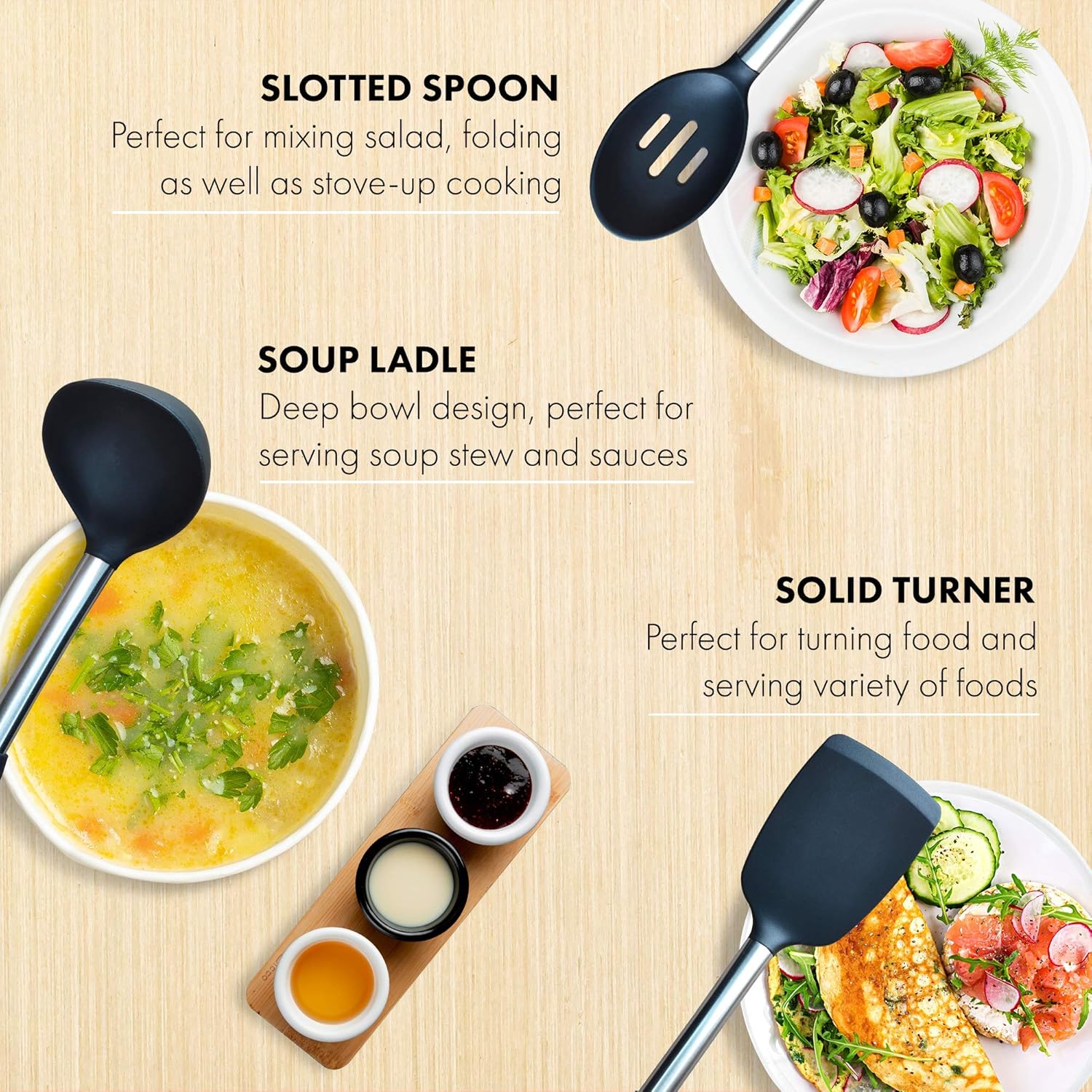 19 PC PREMIUM KITCHEN UTENSIL SET: This silicone cooking utensils set has everything you need for cooking. The kitchen utensils includes a slotted turner, skimmer spoon, whisk, spatula, soup ladle, pasta server, solid turner, slotted spoon, solid spoon, large slotted turner, tongs, and measuring cups.